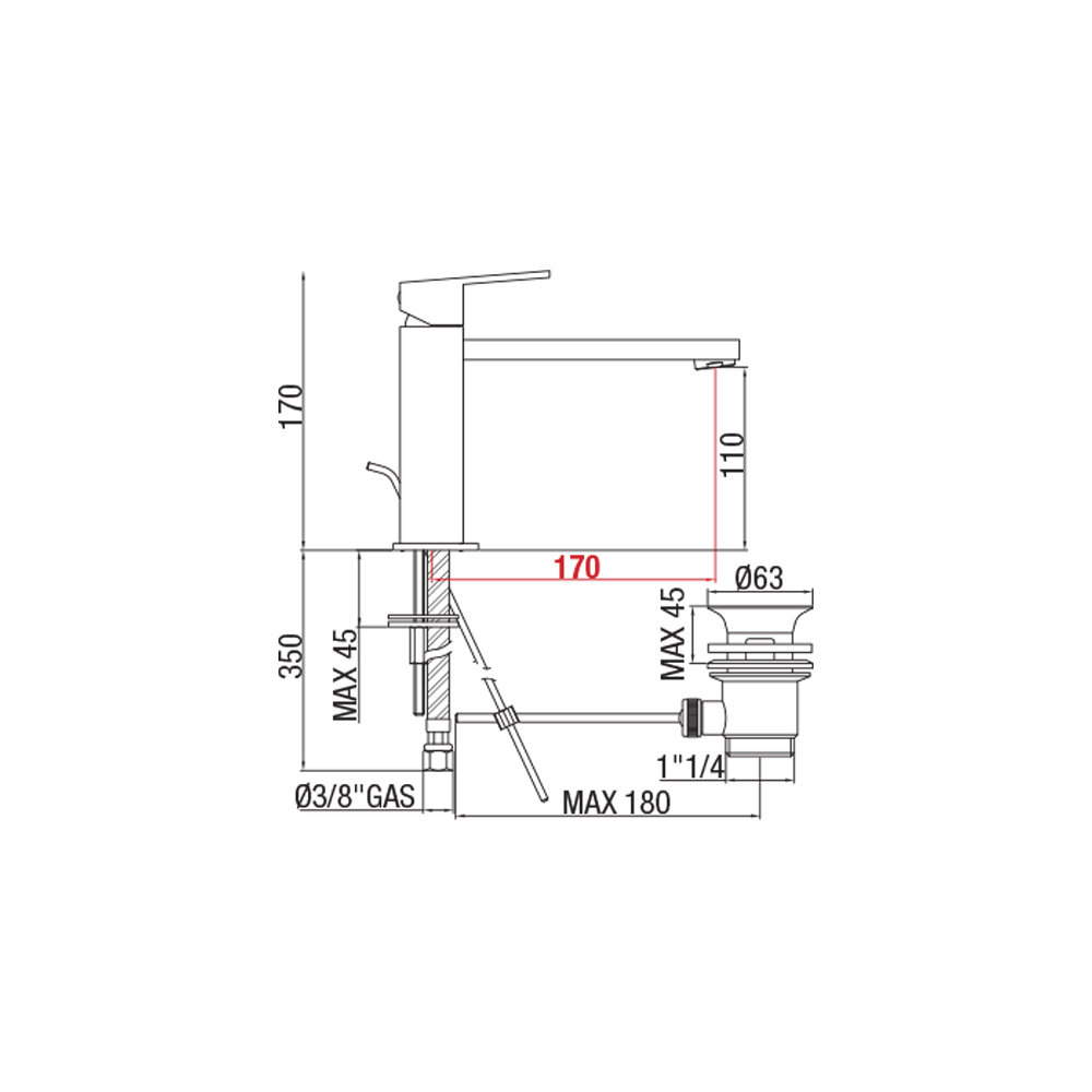 Mezclador de lavabo de baño con caño de 170 mm de distancia entre ejes Made in Italy - Medida