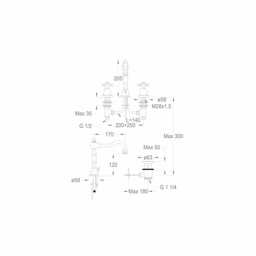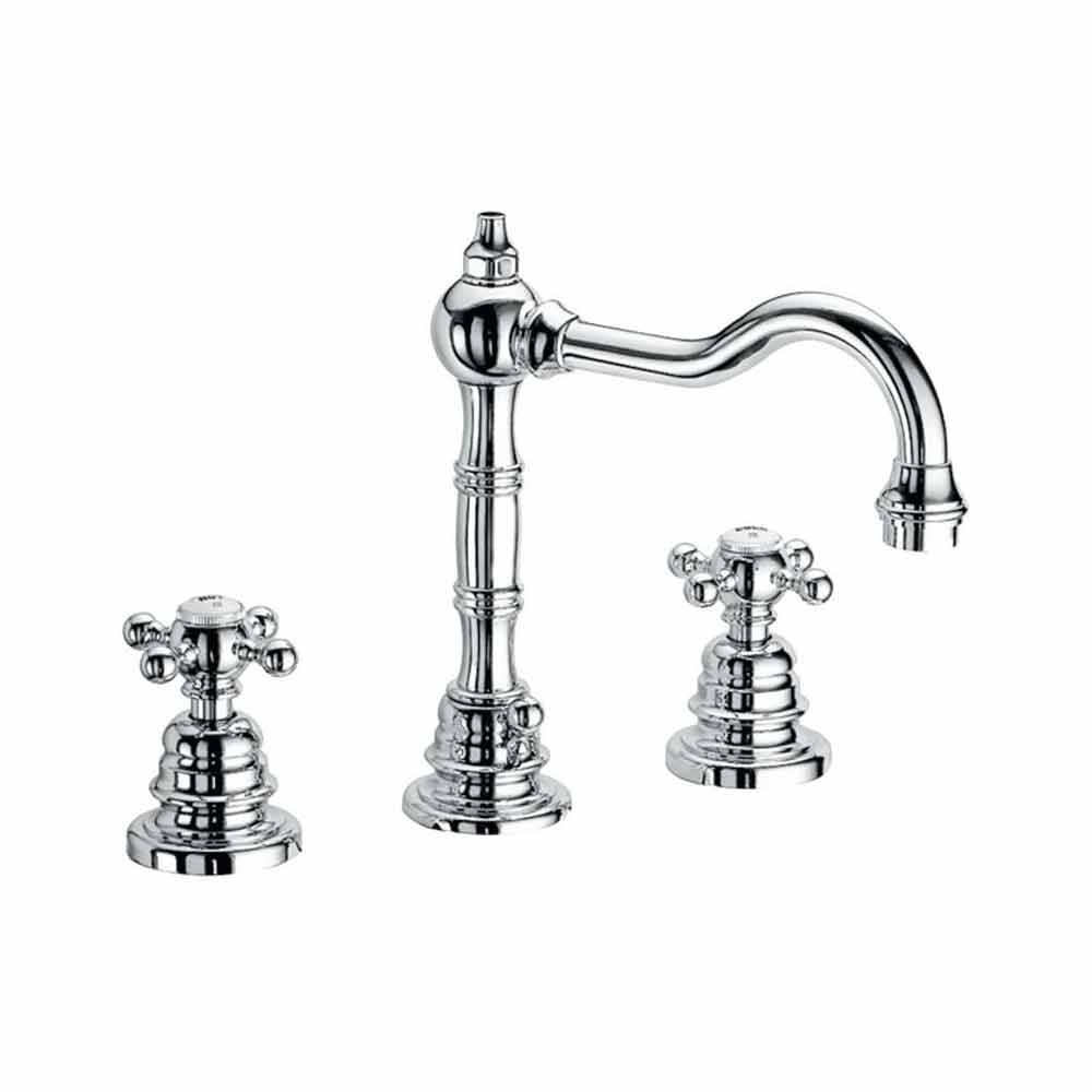 Mezclador de lavabo de sobre encimera de diseño clásico con tres orificios en acabado latón cromado de 205 mm de altura y con un distancia entre ejes de 170 mm con desagüe y desagüe automático. Totalmente producido en Italia con materiales de alta calidad que cumplen con los estándares europeos. Este mezclador se puede instalar en la parte superior, equipado con un aireador y cabezal de cerámica de 180 °; Recomendado por su sistema Energy Saving para ahorro de agua de 6L / min y su caño giratorio.