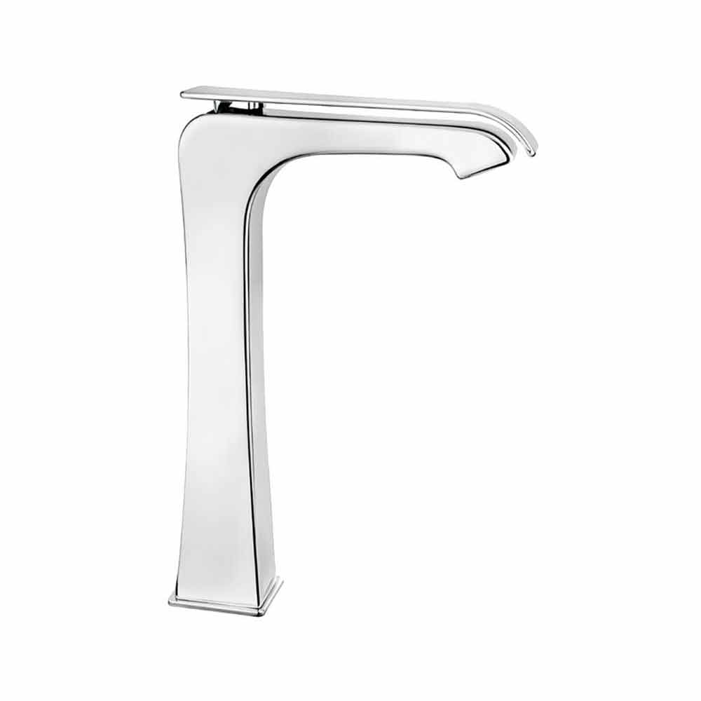 Mezclador de lavabo de sobre encimera de diseño ultramoderno y creativo en latón cromado de 275 mm de altura y con un centro de 135 mm, sin desagüe y sin orificio emergente. Totalmente producido en Italia con materiales de alta calidad que cumplen con los estándares europeos. Este mezclador prevé la instalación en el suelo, equipado con aireador de caché y cartucho de disco cerámico; recomendado por su sistema Energy Saving por ahorro de agua de 6L / min y por sus conexiones flexibles.