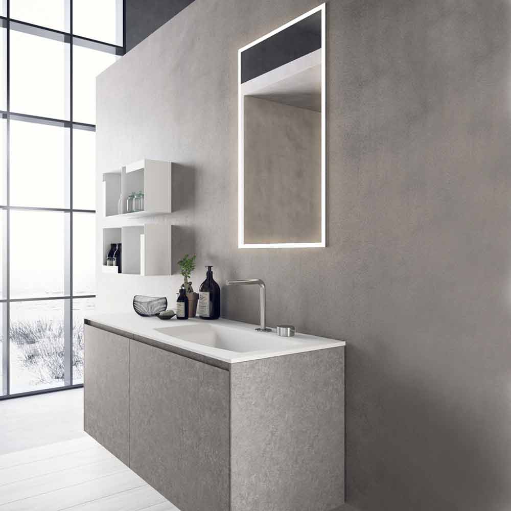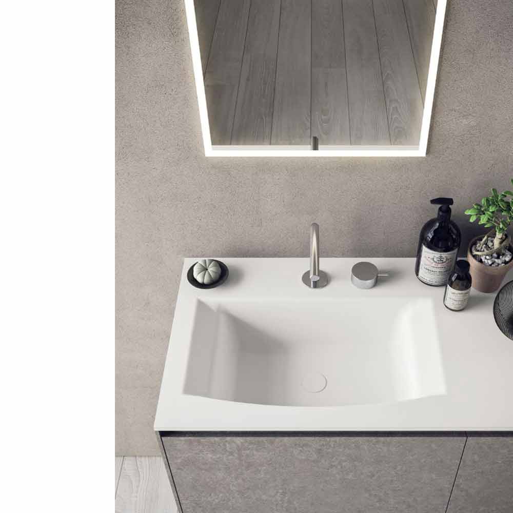 Esta claridad formal viene dada por la puerta ranurada con perfil inclinado y por el espejo rectangular ultramínimo con marco autoiluminado. La peculiaridad de esta composición viene dada por el lavabo encastrado caracterizado por dos lados laterales que descienden suavemente hacia el lavabo.