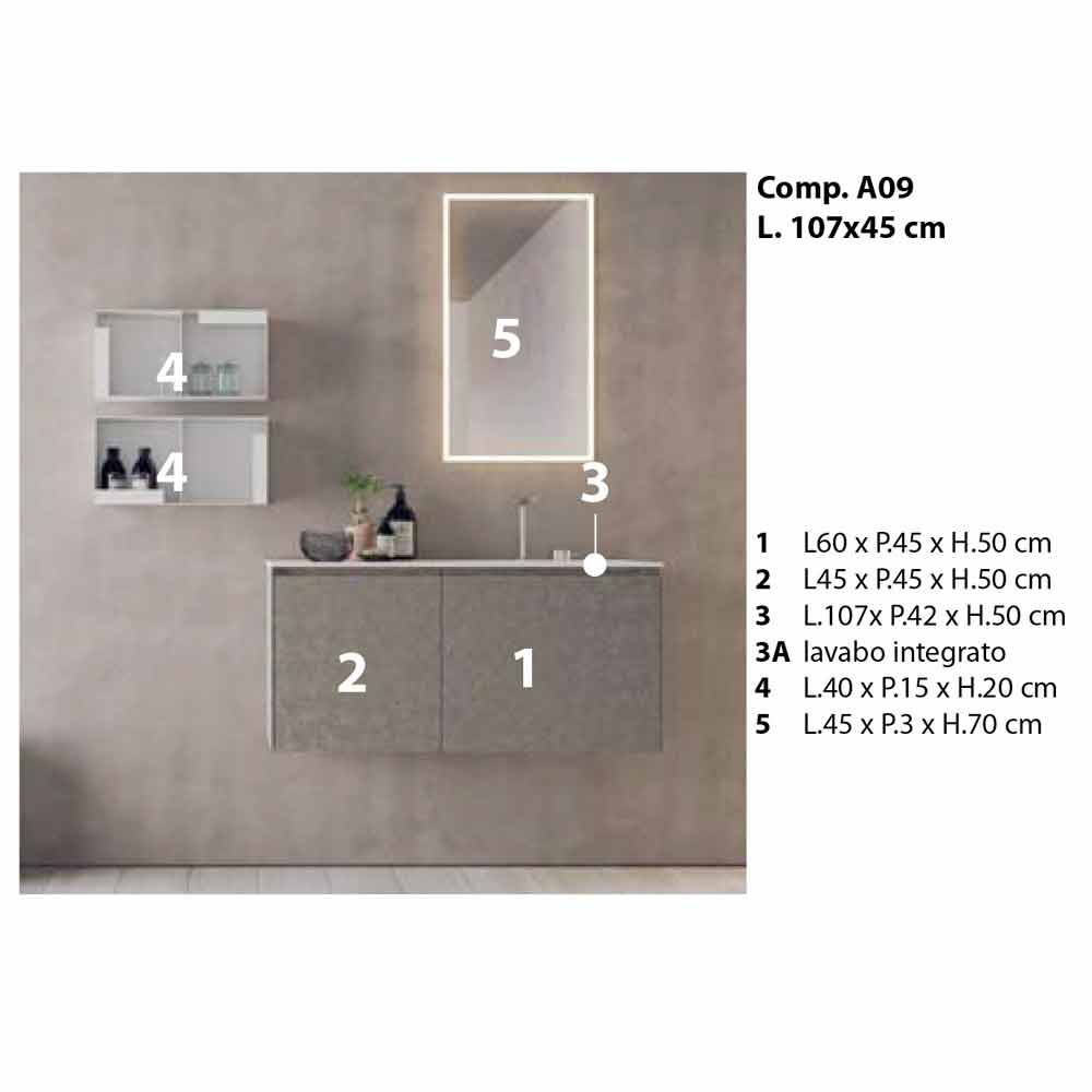 La composición incluye: 1 L60 x P.45 x H.50 cm 2 L45 x P.45 x H.50 cm 3 L.107x P.42 x H.50 cm Lavabo integrado 3A 4 L.40 x P.15 x H.20 cm 5 L.45 x P.3 x H.70 cm