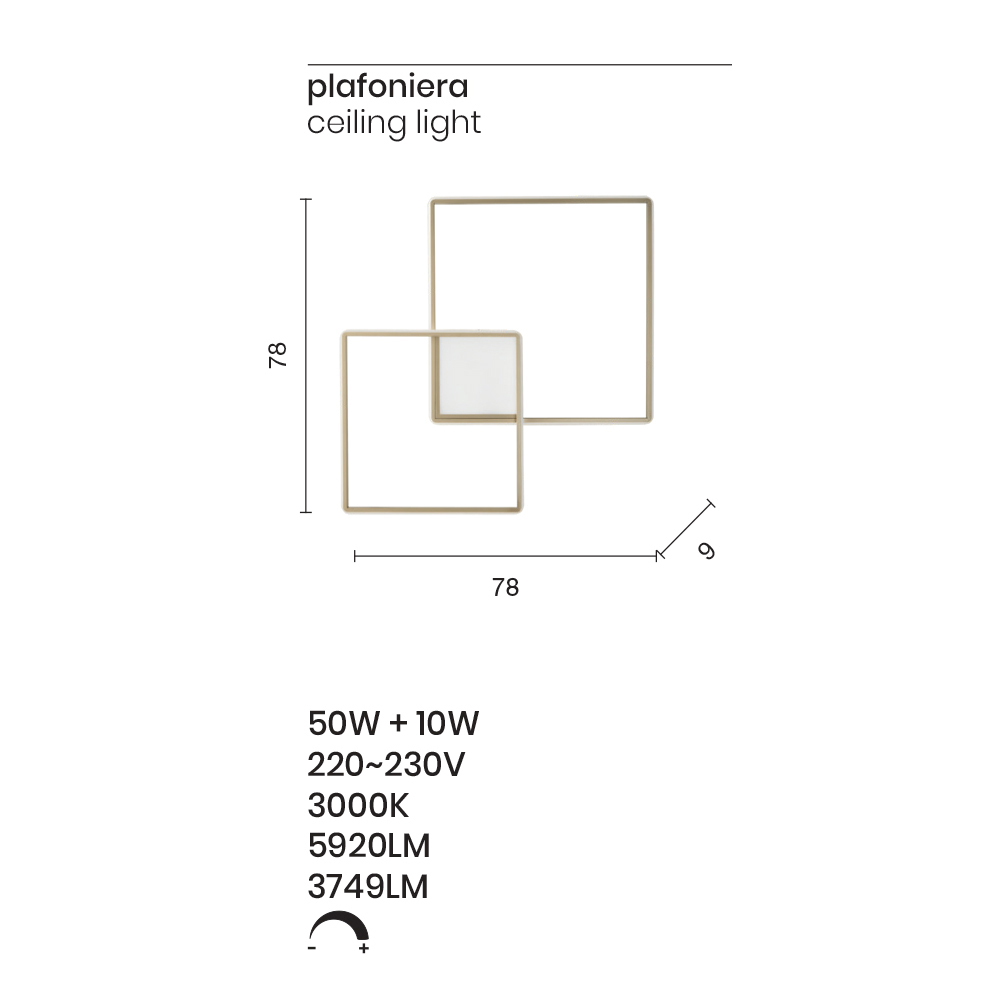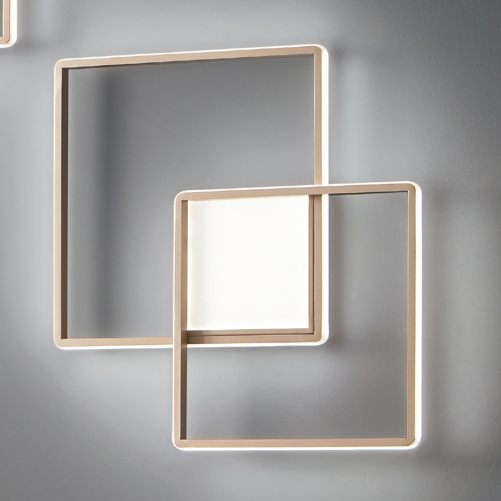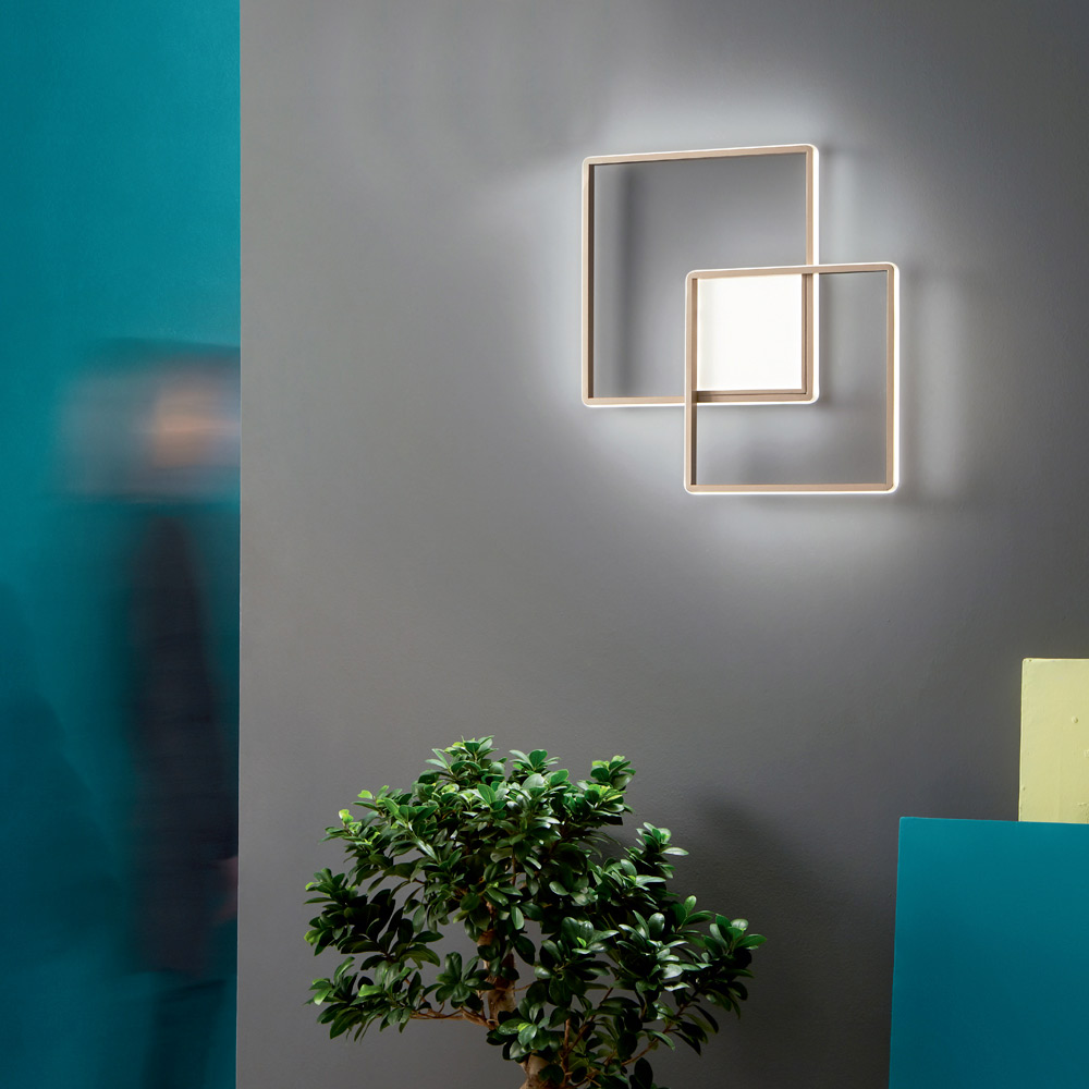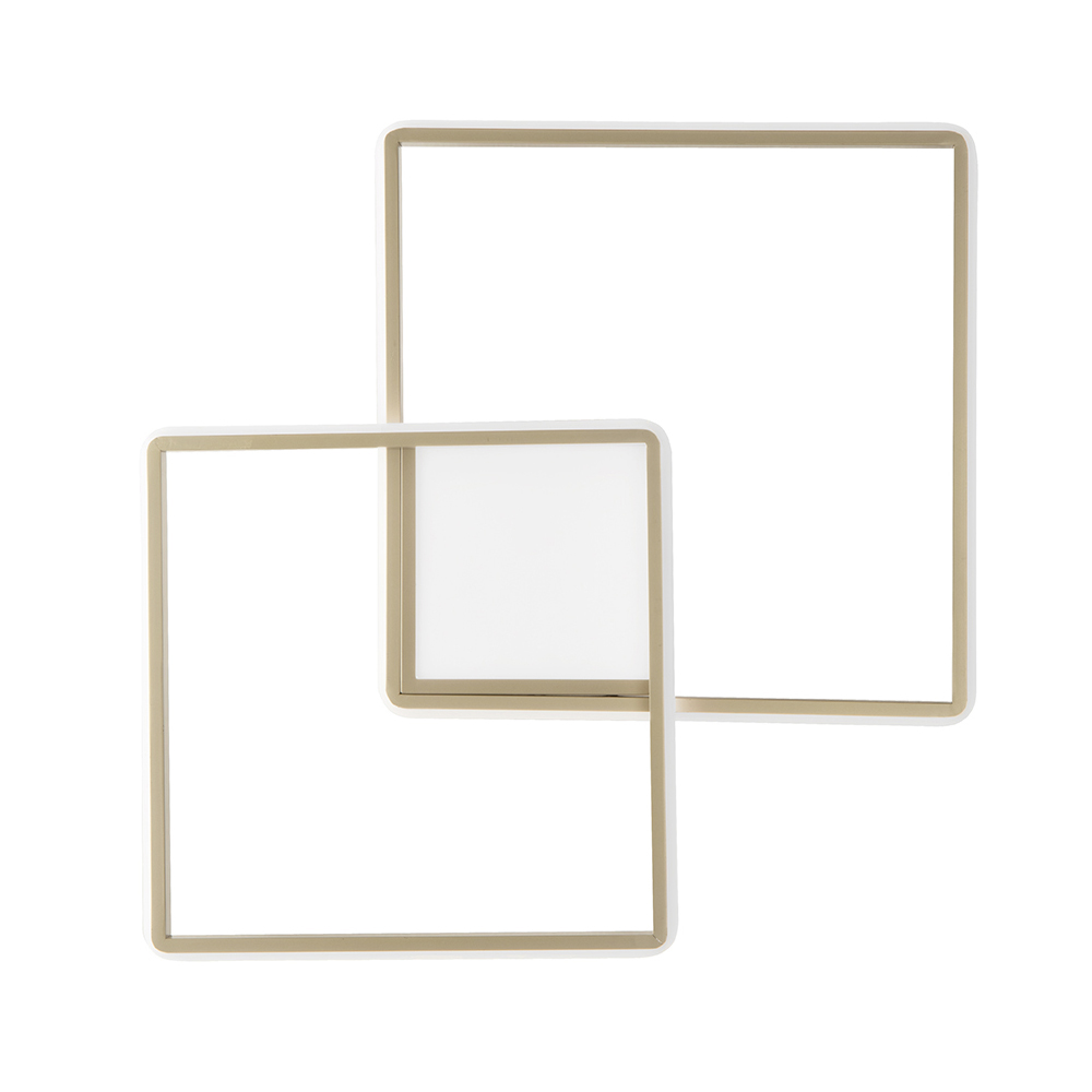 Aplique de pared en metal pintado con acabado dorado completo con fuente de LED regulable integrada. Un complemento moderno cuya estética está marcada por formas simples y líneas originales y cuadradas , concebido y diseñado para iluminar y amueblar espacios domésticos como entradas, pasillos, dormitorios, áreas de estar o cocinas de una manera exclusiva y elegante. El acabado dorado refinado subraya el diseño refinado y lo convierte en un producto único en su tipo para un resultado adecuado para quienes buscan una perfección estética de las formas geométricas incluso en el mobiliario de su hogar. Su conformación también la hace instalable en el techo, convirtiéndose en un verdadero plafón y aumentando así su funcionalidad y versatilidad.