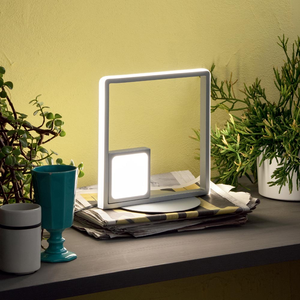 Lámpara de sobremesa en metal pintado plateadocon fuente de LED regulable integrada. Un accesorio moderno cuya estética está marcada por formas sencillas y líneas originales y cuadradas , concebido y diseñado para iluminar y amueblar espacios domésticos como salones, dormitorios, oficinas y estudios de forma exclusiva y elegante. El acabado refinado subraya el diseño refinado y lo convierte en un producto único en su tipo para un resultado adecuado para aquellos que buscan una perfección estética de las formas geométricas incluso en sus muebles para el hogar.
