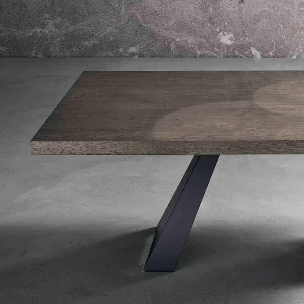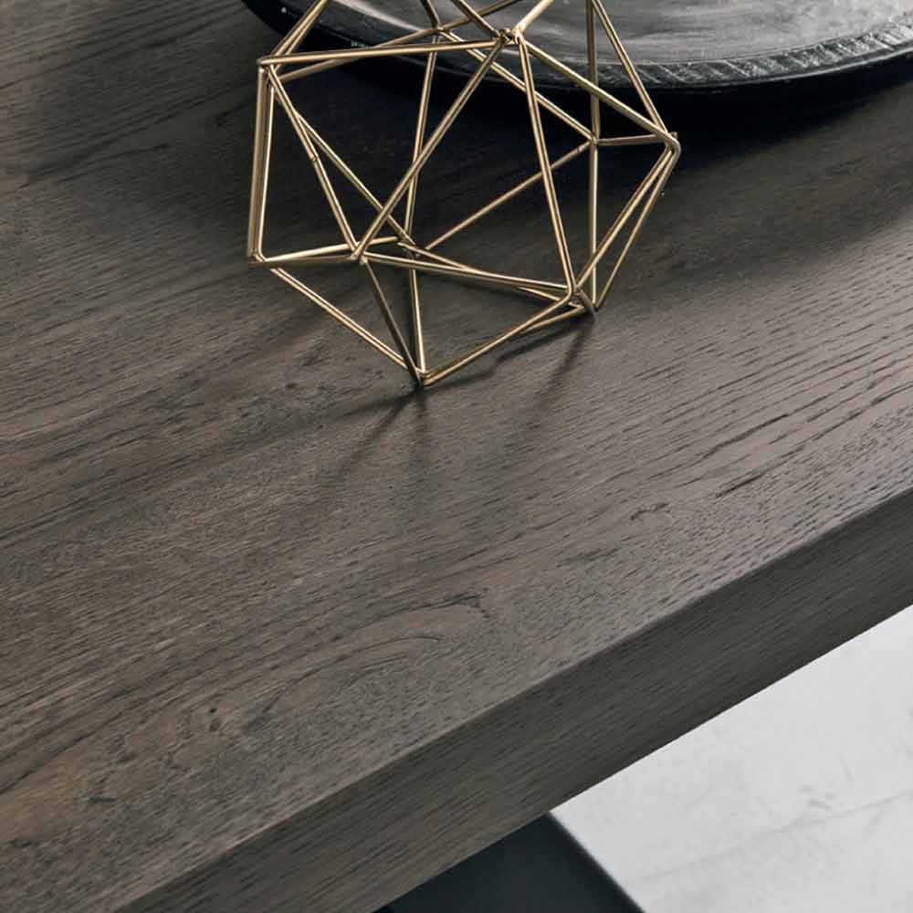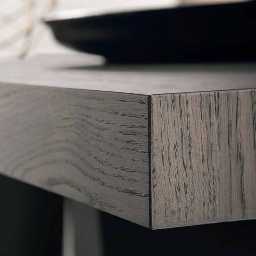 Su estructura está formada por paneles inclinados en metal acabado antracita micrograbado; mientras que la tapa , que tiene un espesor de 60 mm, está realizada en chapa de roble anudada con elaboración plegable. Disponible en muchos tamaños y acabados: Medidas
