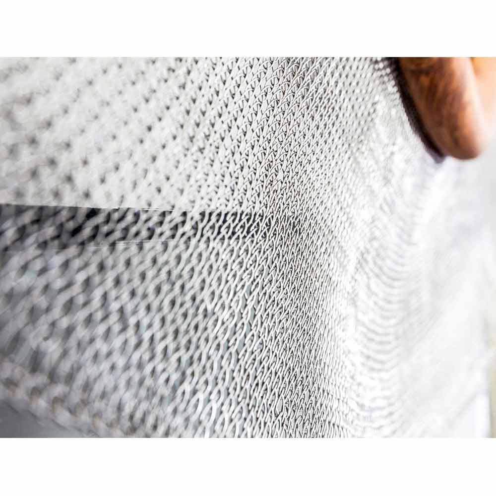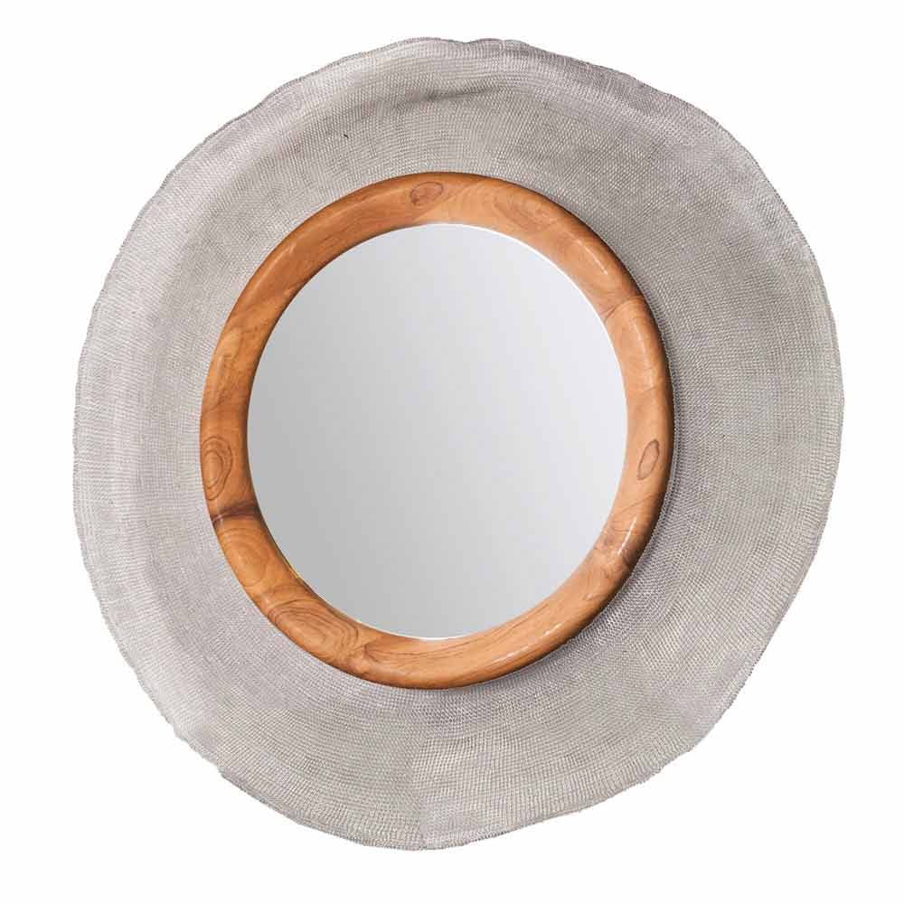 Hecho con una malla de metal tejida a mano y aplicado a lo largo del marco de teca pulida del espejo; la malla de alambre se puede moldear según su gusto. Gracias a su diseño innovador, elegante y refinado, se puede colocar en cualquier ambiente desde el salón hasta el dormitorio; desde la oficina hasta el baño.