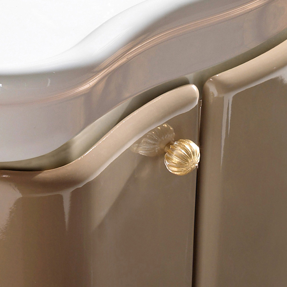 Mueble de baño en MDF con dos puertas y cajón lacado brillo bicolor caramelo con estructura marfil , con lavabo de cerámica blanca .Las perillas de latón y el fregadero están incluidos.