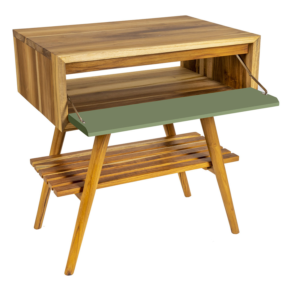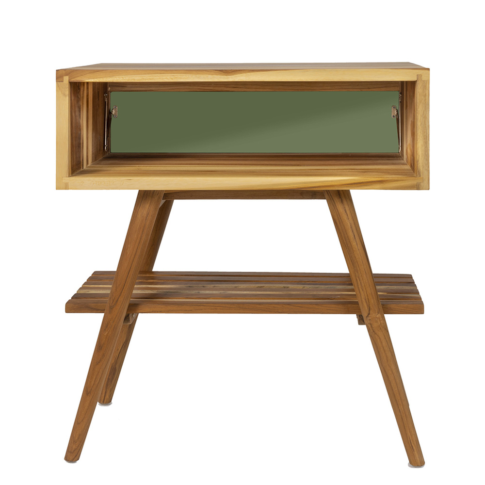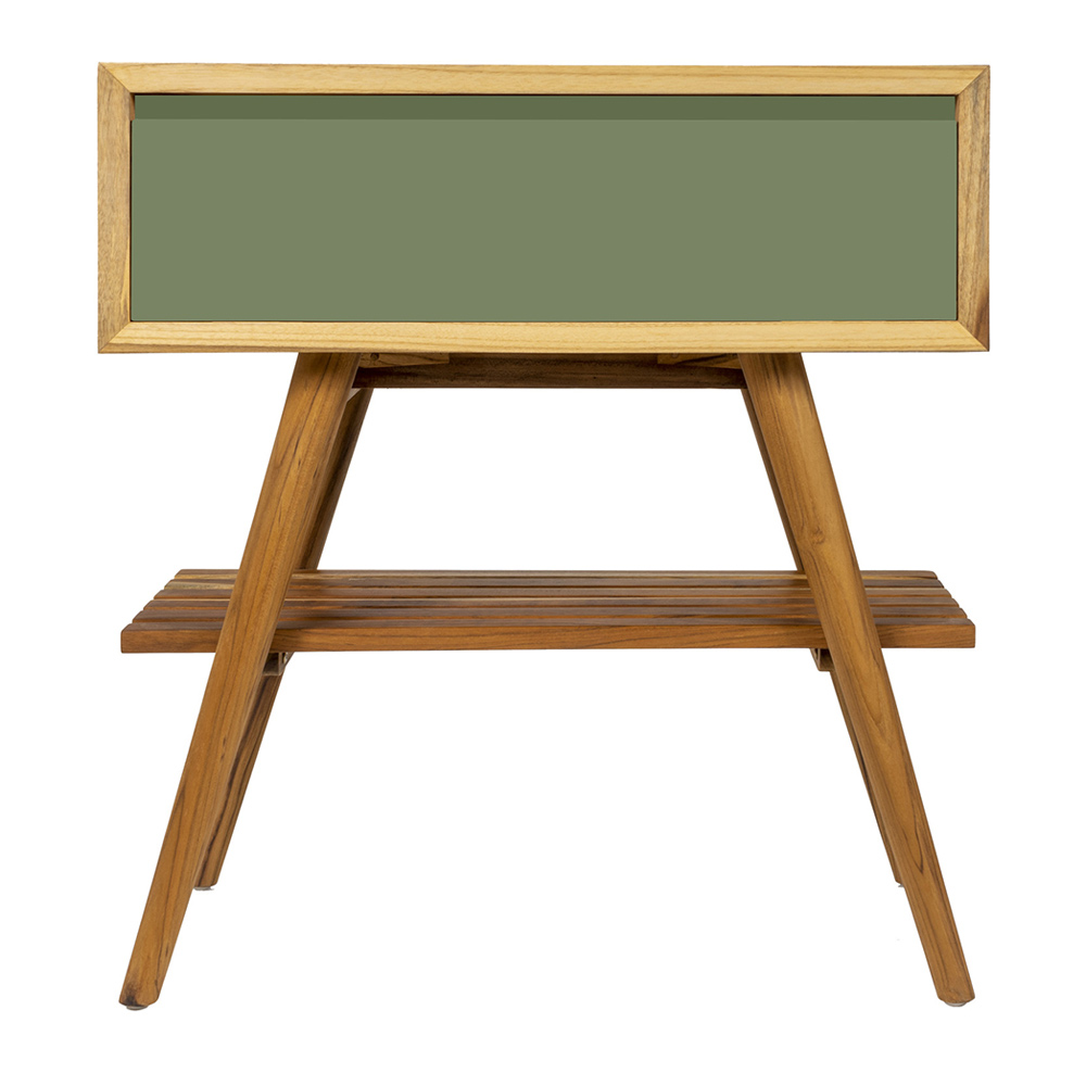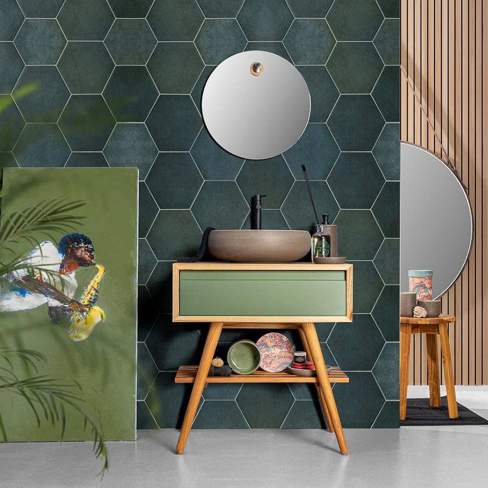 Mueble de baño de pie realizado en tecanatural recuperada con cajón abatible en madera de caobaverde , matiz asociado a todo aquello que recuerda la naturaleza, la primavera y el florecimiento de las plantas y que indica fertilidad, renovación y esperanza. Su estructura se caracteriza por formas sencillas y espacios prácticos ideales para organizar la zona de baño de forma elegante y funcional para un resultado original con una marcada personalidad moderna .