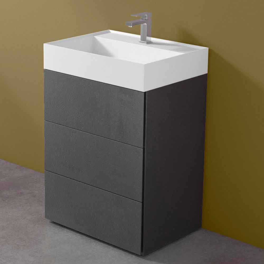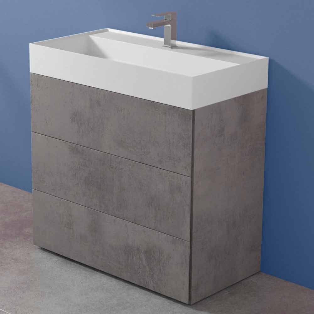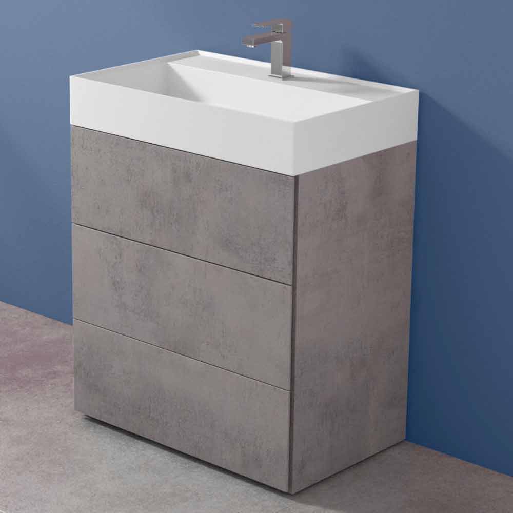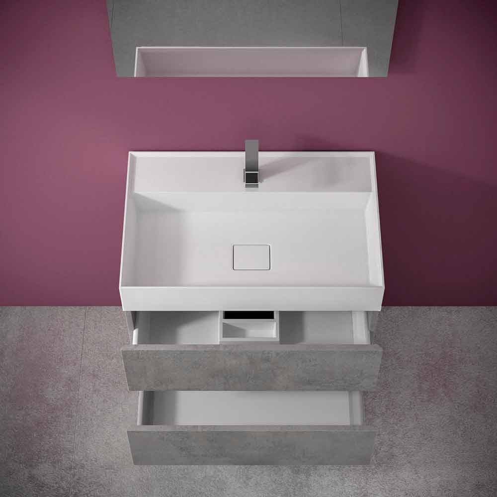 Este mueble de baño autoportante se propone con un diseño minimalista para amueblar el baño moderno, prestando atención a los detalles más pequeños para no descuidar la importancia de la practicidad y la funcionalidad. Los 3 amplios cajones de acero color plata con extracción total, equipados con guías telescópicas silenciosas de gran suavidad, con sistema de cierre suave, permiten un uso óptimo y cómodo de los espacios interiores de estos muebles de baño.