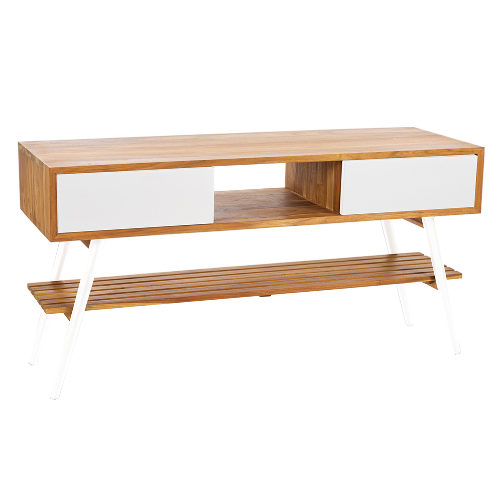 Mueble de baño de pie de teca natural reciclada completo con 2 prácticos cajones de madera de caoba pintada en blanco mate del mismo color que las patas. Una tonalidad pura y elegante que recuerda el deslumbrante reflejo de la nieve al sol y combina perfectamente con la madera de teca para un resultado con una fuerte personalidad escenográfica. Una estética deliberadamente gráfica realzada aún más por la combinación del cajón doble para la fachada.