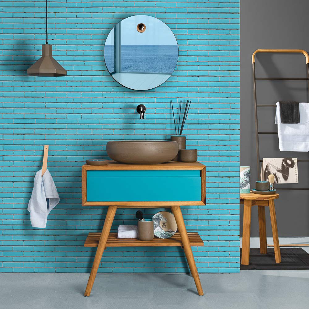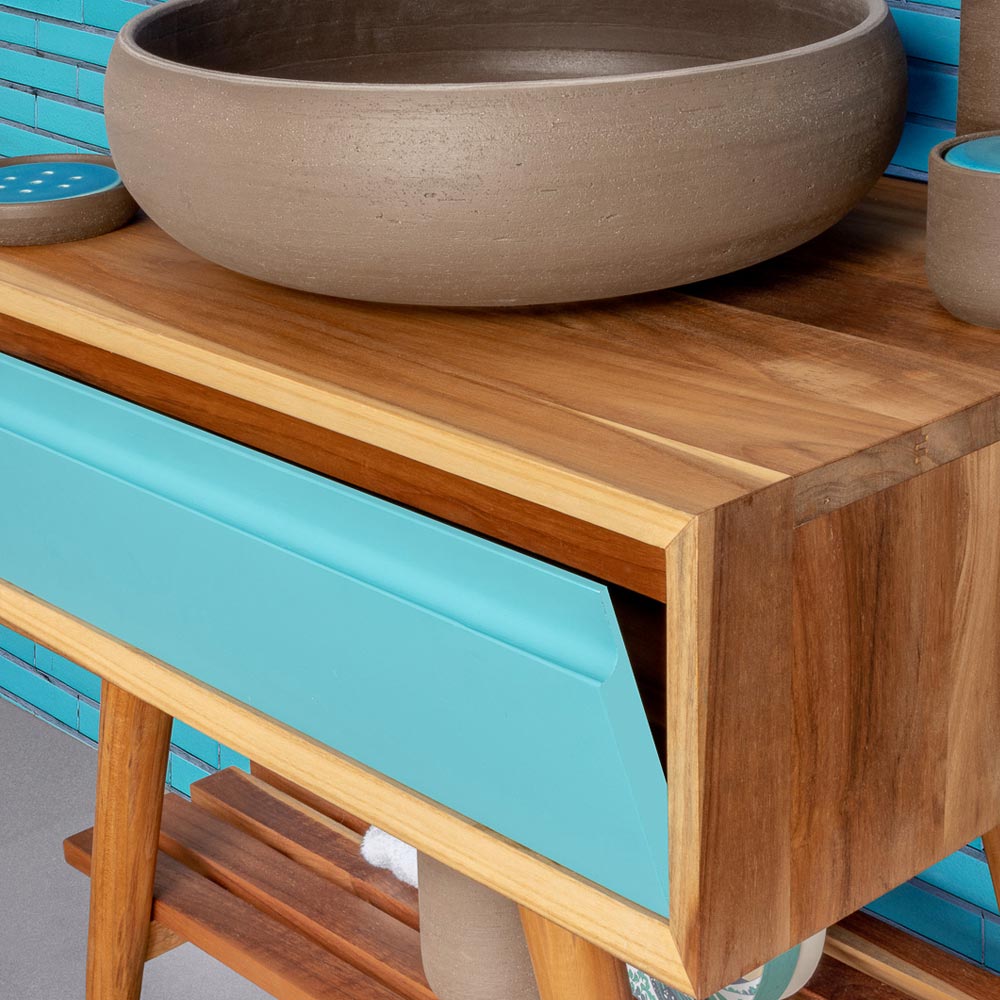 Mueble de baño de pie fabricado en tecanatural recuperada con cajón abatible en madera de caobaazul , color que hace referencia a la calma y la serenidad asociadas a elementos naturales como el agua y el aire ofreciendo efectos relajantes, emociones que remiten al encanto dominante de la naturaleza. Su estructura se caracteriza por formas sencillas y espacios prácticos ideales para organizar la zona de baño de forma elegante y funcional para un resultado original con una marcada personalidad moderna .