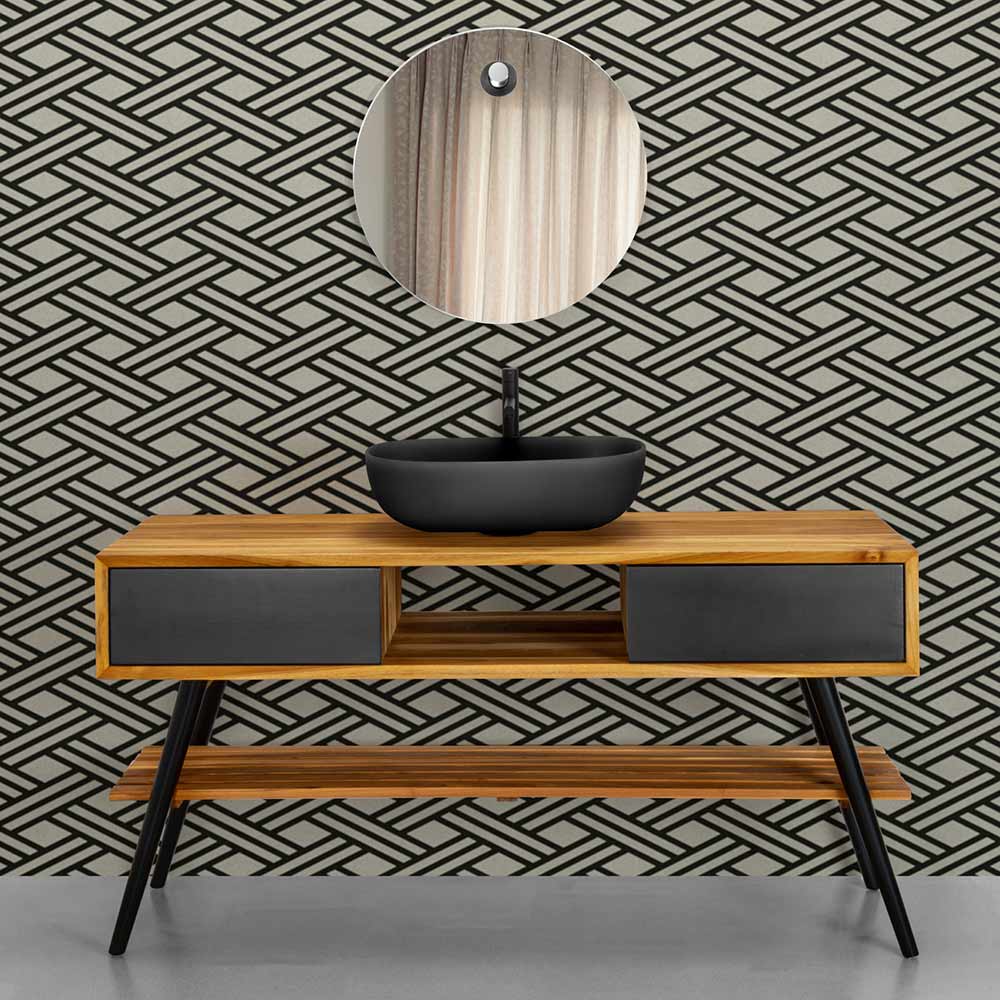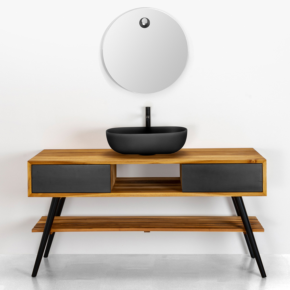 Mueble de baño independiente con estructura de teca natural reciclada enriquecida con 2 cajones de madera de caoba pintada en negro mate a juego con las patas. Una elección de color elegante y con estilo que se destaca en cada situación de decoración, haciéndola fascinante y misteriosa y revelando atmósferas exclusivas y emociones únicas. Una estética deliberadamente gráfica realzada aún más por la combinación del cajón doble para la fachada.