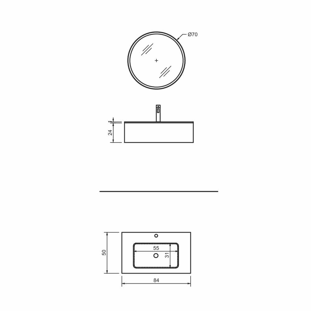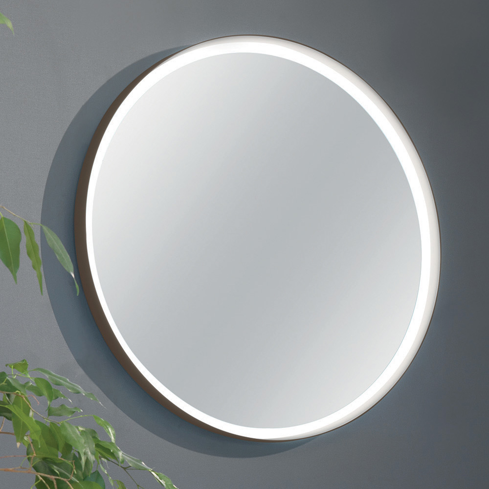 Al final del diseño funcional , el sistema de apertura total con sistema push & pull y el espejo redondo con chorro de arena exterior e iluminación LED integrados en toda la circunferencia, combinados con un marco de metal lacado bronce patinado mate.