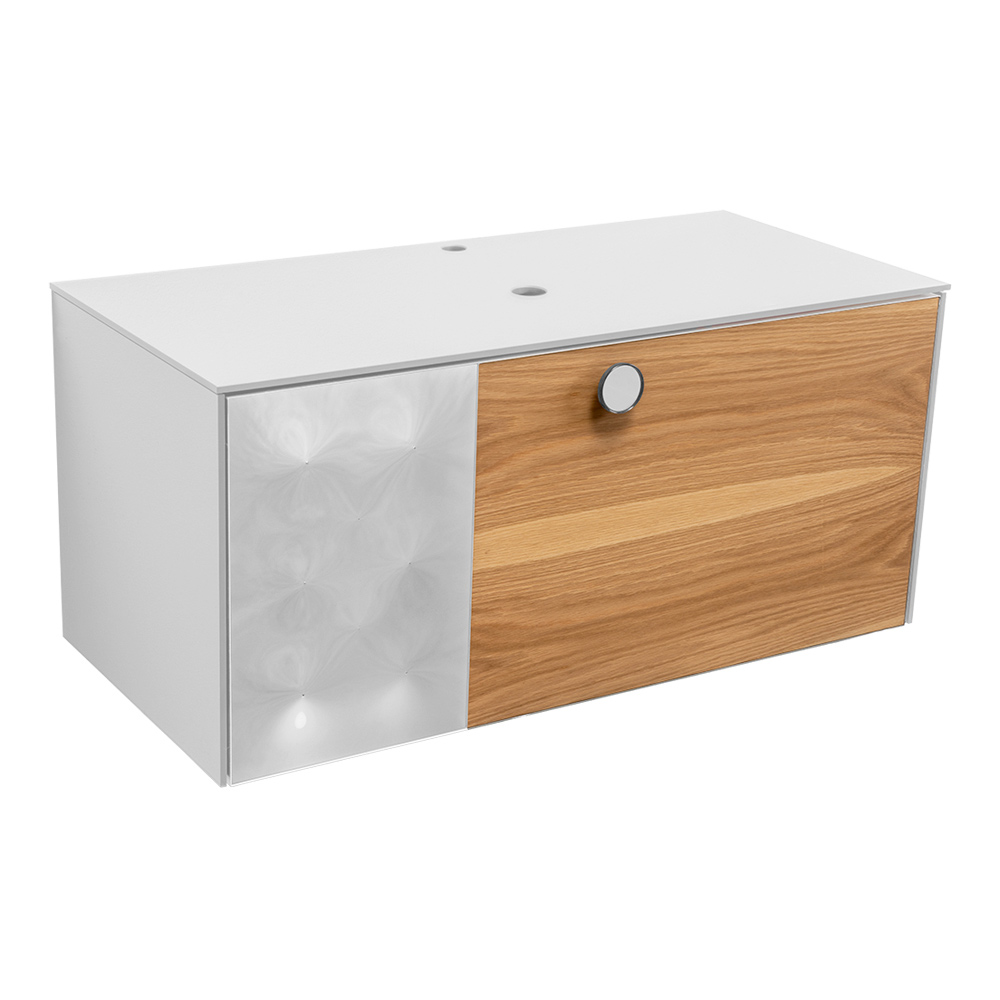 El módulo suspendido cuenta con un cajón interior : el primero con reserva para el desagüe, equipado con separadores y un frontal de roble y el segundo con un gran espacio de almacenamiento.