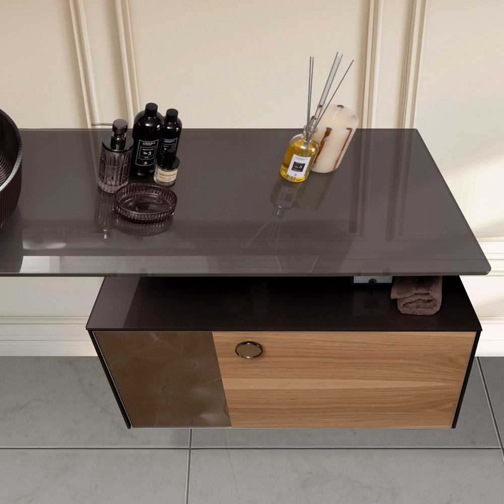 La parte central de madera natural con veta visible combina armoniosamente con la tapa y los laterales, fabricados en vidrio templado extraclaro de color de 8 mm . El lateral del cajón es de vidrio curvado , caracterizado por un efecto tridimensional con reflejos luminosos, que enriquece el diseño con un detalle distintivo y refinado.