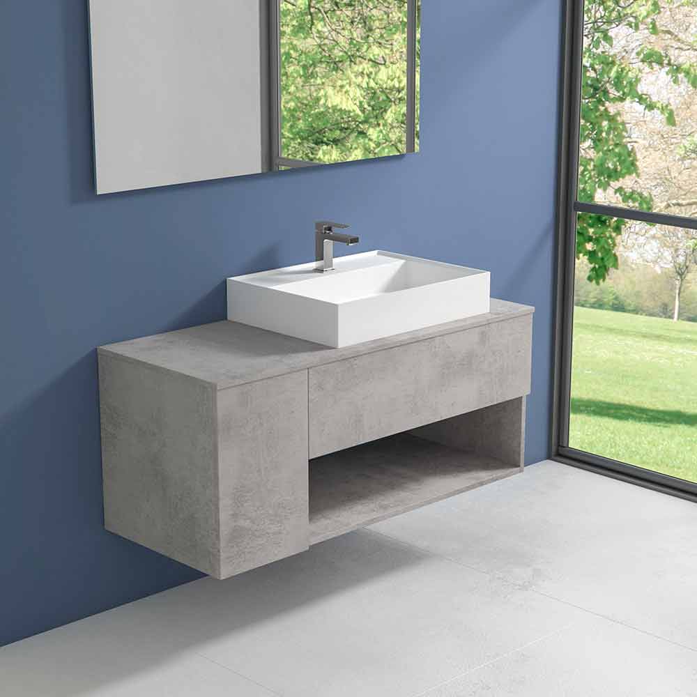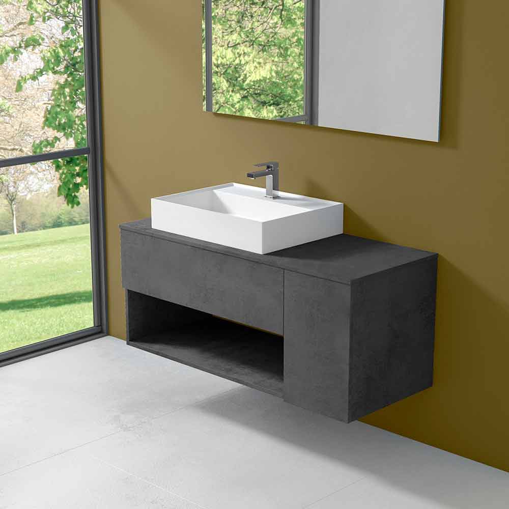 El mueble bajo lavabo con cajón y compartimento abierto está fabricado en fibra de madera laminada e hidrófuga Hydro W 100 , para garantizar una mayor durabilidad y evitar que el mueble se dañe en contacto con el agua.