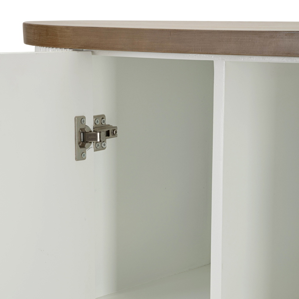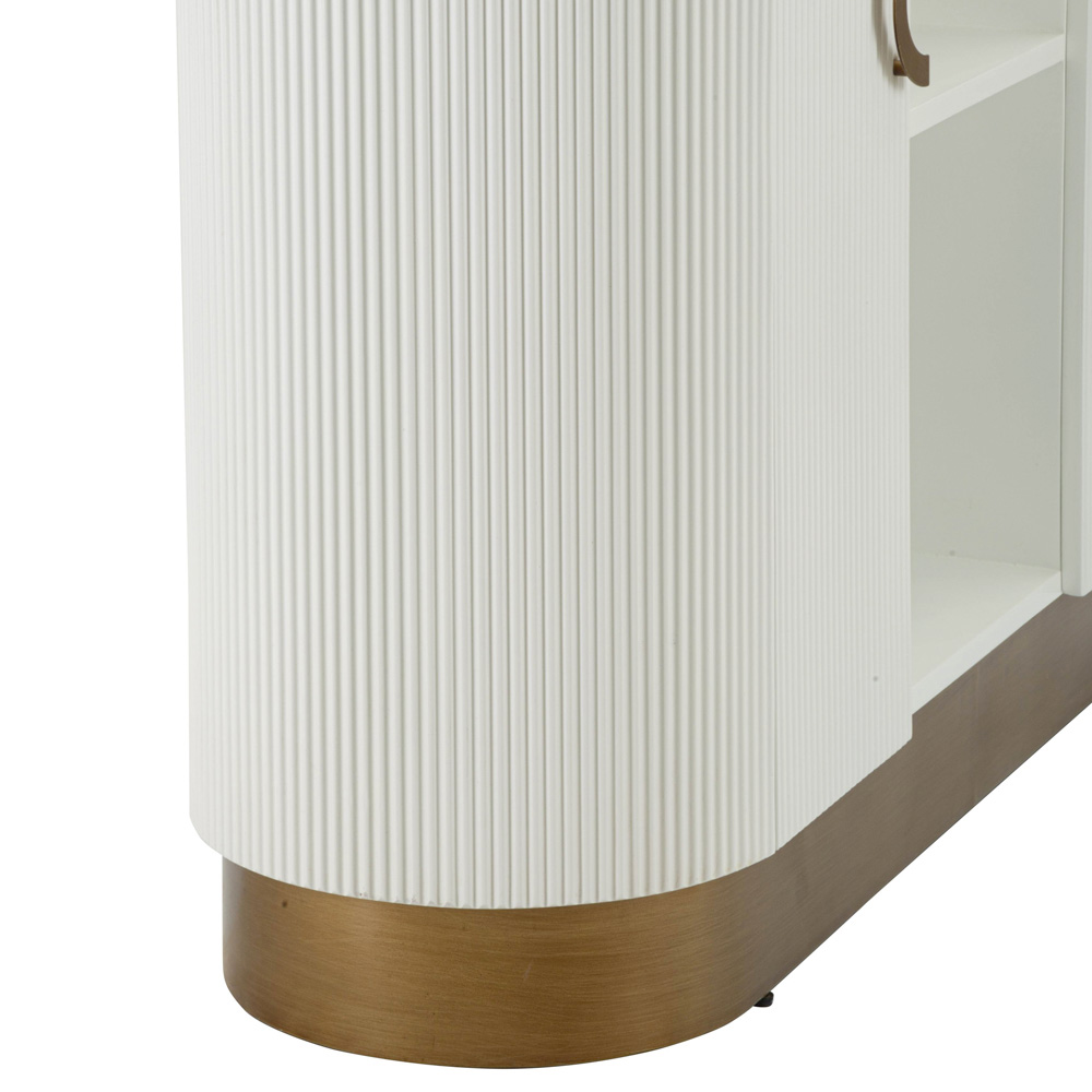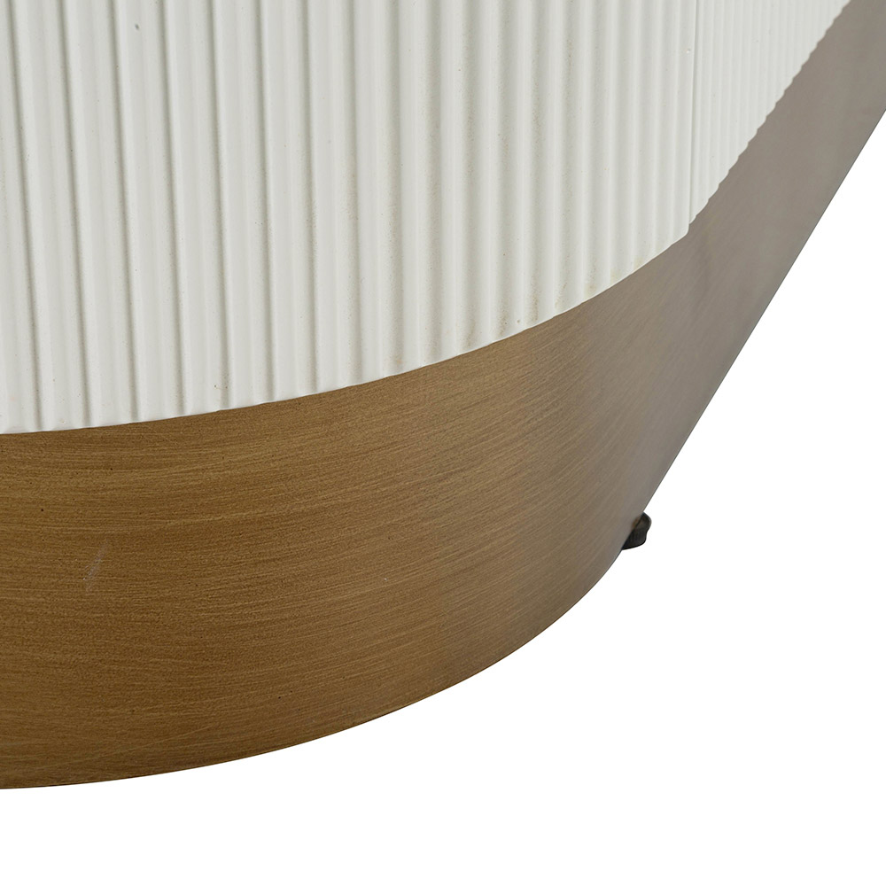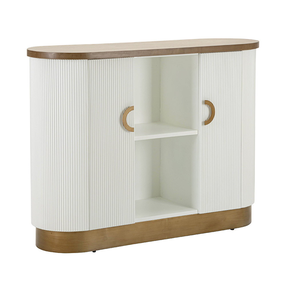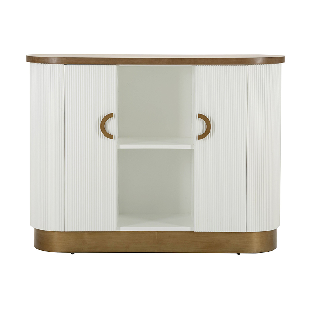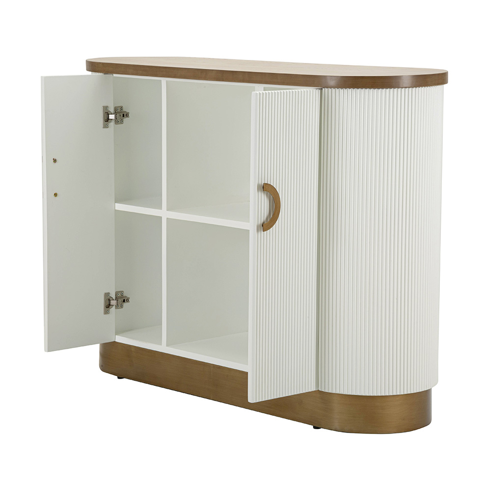 Este mueble curvilíneo encarna la combinación perfecta entre funcionalidad y estilo sofisticado . La silueta suave y las esquinas redondeadas del gabinete se destacan por el cálido acabado que enmarca las puertas blancas acanaladas . El efecto acanalado vertical no sólo añade textura y profundidad visual, sino que también evoca una sensación de elegancia clásica renovada.