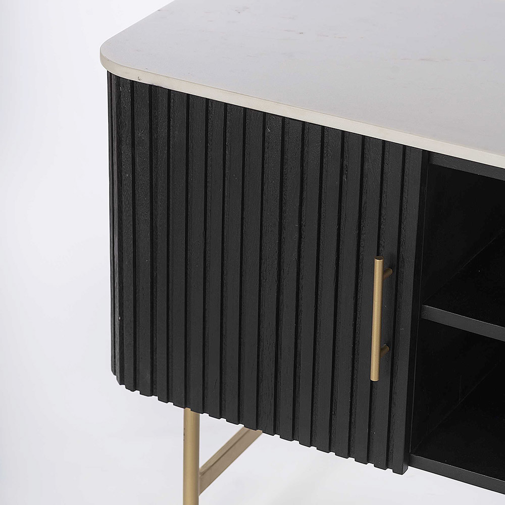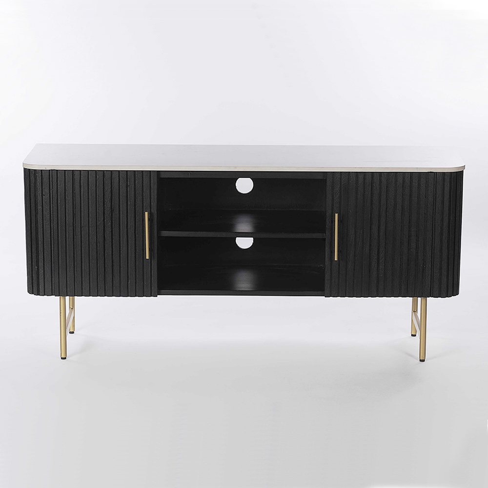 Este mueble de TV es la esencia de la elegancia contemporánea, combinando diseño moderno y funcionalidad . El marco de madera acanalado en negro aporta un sofisticado efecto tridimensional, perfectamente equilibrado por la tapa lisa que añade un toque refinado. Las finas pero robustas patas de metal dorado aportan ligereza visual y garantizan la estabilidad.