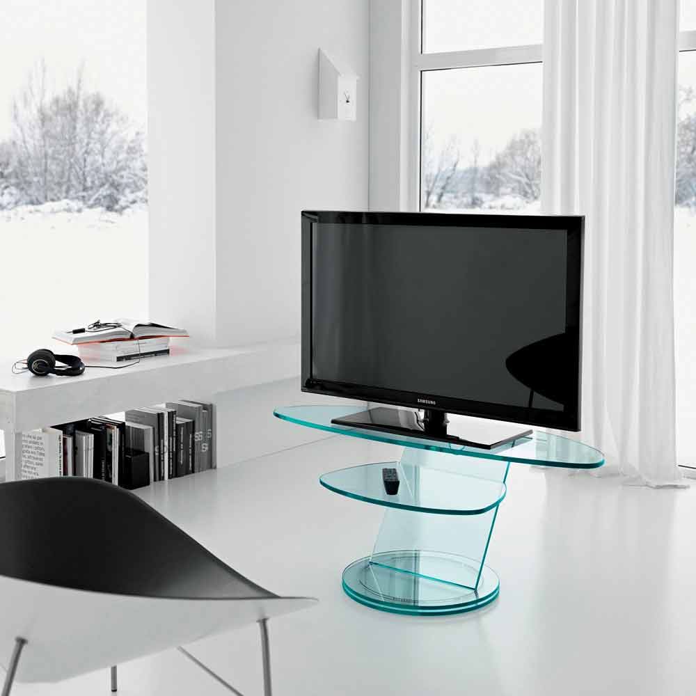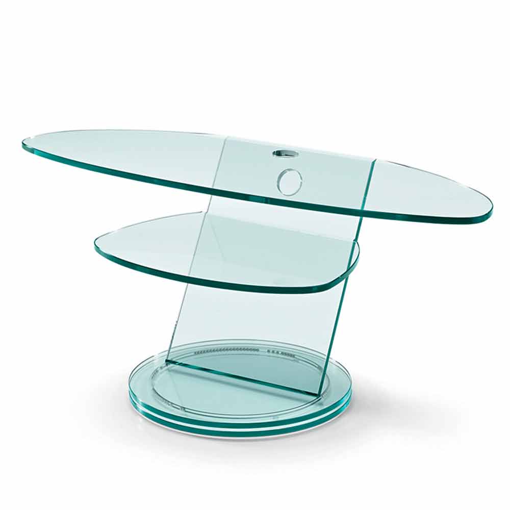 Compuesto por una encimera de TV elíptica y un estante inferior, la característica peculiar es la base giratoria que cuenta con un sistema patentado de esferas de acero que permiten girar los cimientos, para un máximo diseño y practicidad.