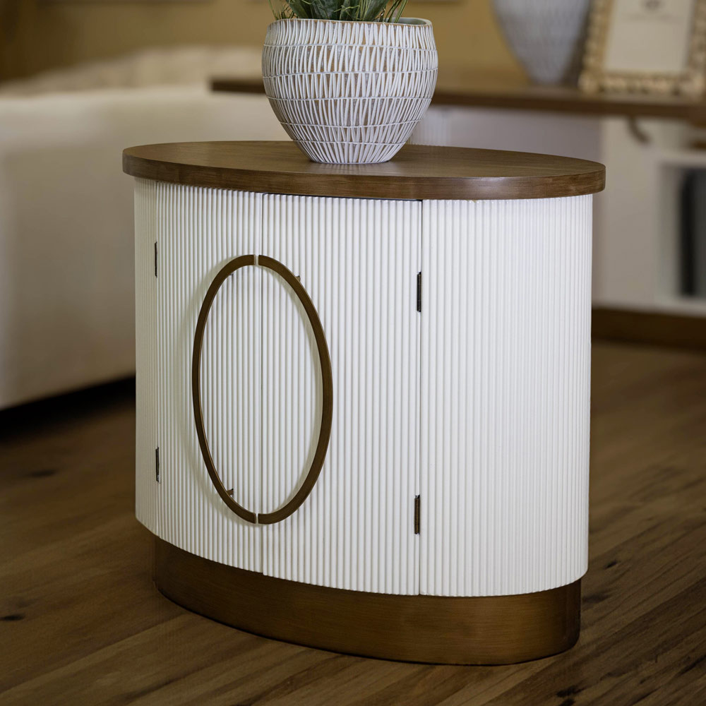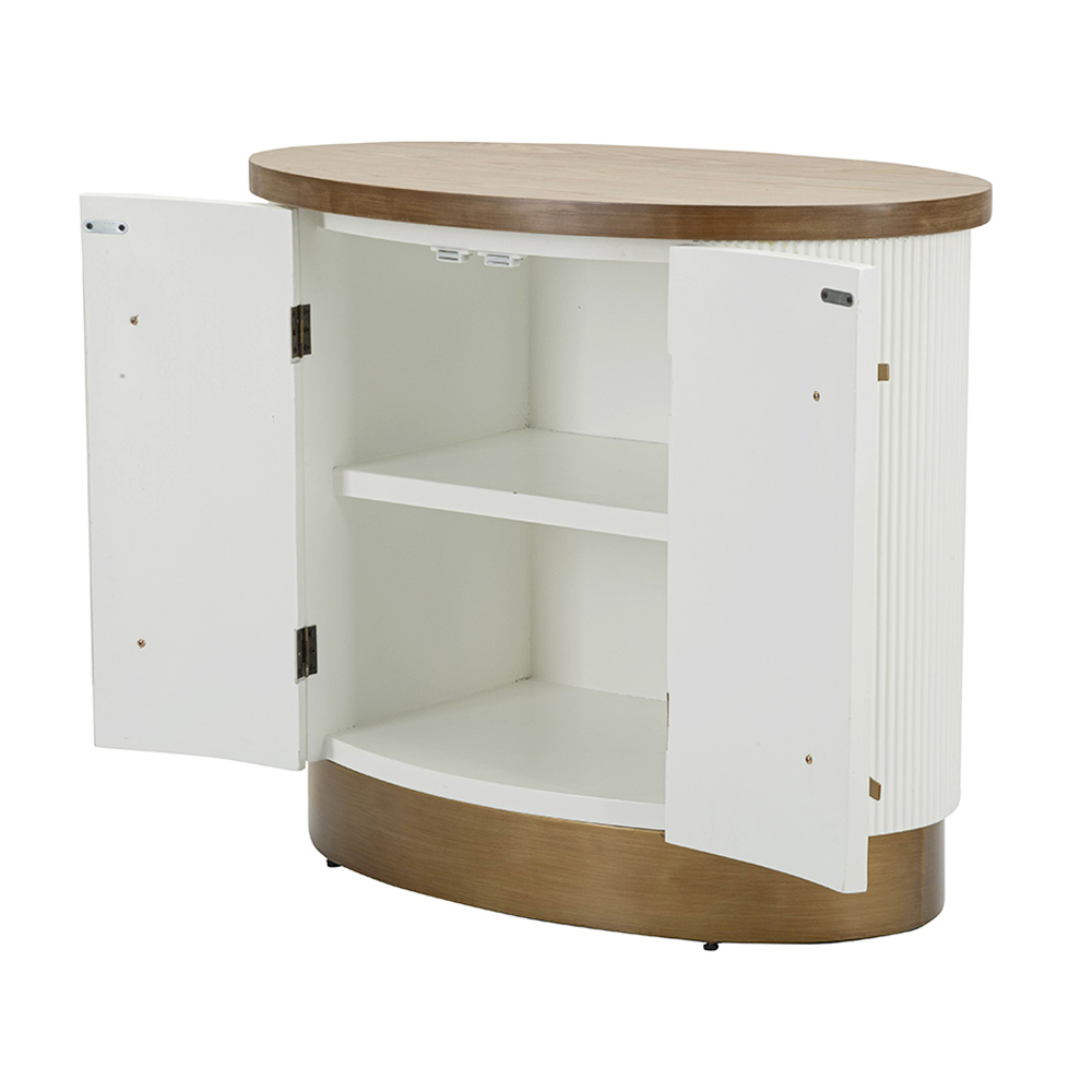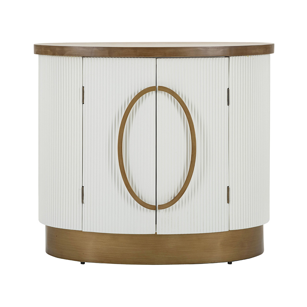 La ingeniosa ranura de las puertas añade un delicado juego de luces y sombras, mientras que los tiradores circulares aportan un toque de refinamiento . Este mueble ofrece no sólo un punto de interés estético, sino también una abundante capacidad de almacenamiento, lo que lo hace tan práctico como bonito.