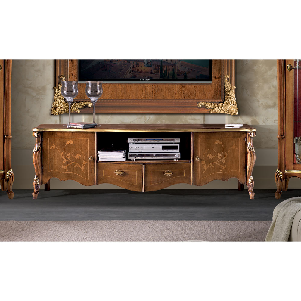 Mueble de TV de salón de estilo clásico con 2 puertas, 2 cajones y 1 compartimento, fabricado en nogal Bassano con detalles en oro antiguo. Una pieza única y refinada, elaborada íntegramente en Italia por hábiles maestros artesanos , maestros del arte que terminan cada pieza con maestría y elegancia. La producción se realiza con materiales de alta calidad y se elabora artesanalmente con el máximo cuidado y profesionalismo que distingue a los productos Made in Italy .