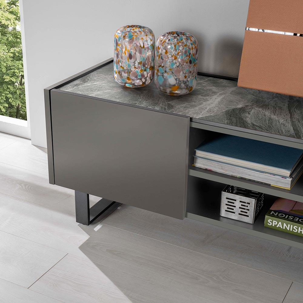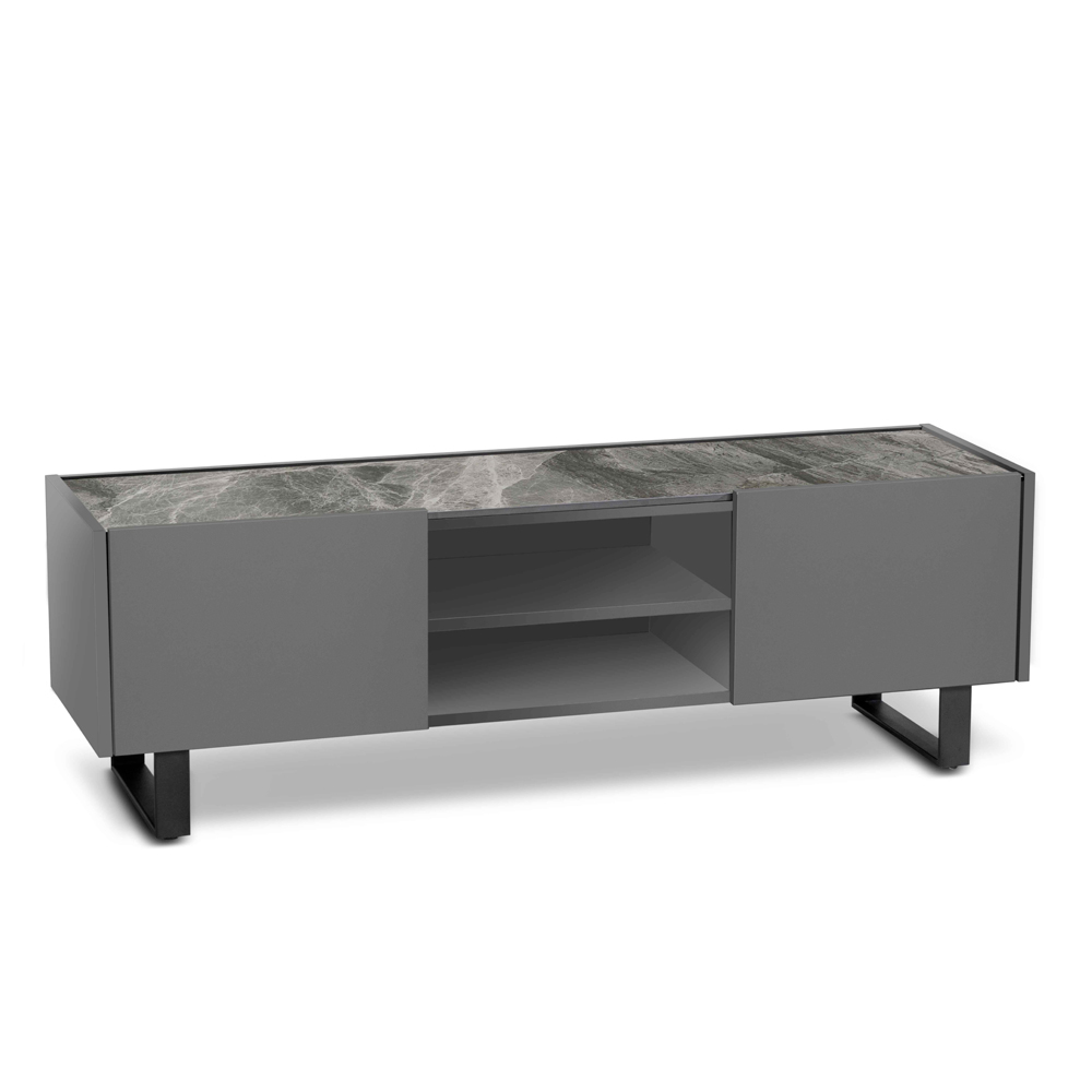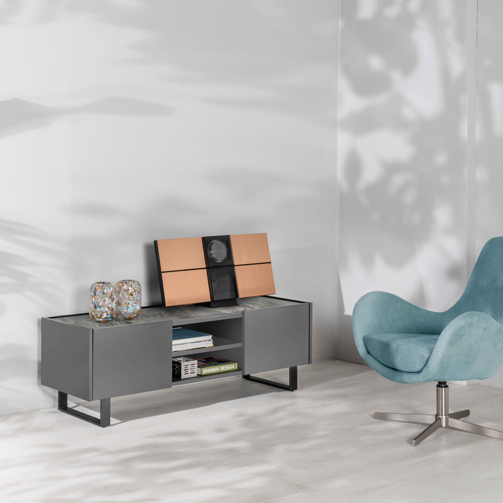 Mueble TV de interior fabricado con tapa de cerámica efecto mármol gris , estructura de MDF chapado en roble gris oscuro , patas de metal,2 puertas con cierre suave y 2 compartimentos abiertos . Clásico y elegante, este mueble de MDF chapado destaca por su carácter moderno y sus líneas limpias. La encimera de cerámica efecto mármol descansa sobre una estructura refinada y discreta. El mecanismo de cierre suave hace que este artículo sea compatible con hogares modernos que privilegian la funcionalidad, sin renunciar a un toque de clase.
