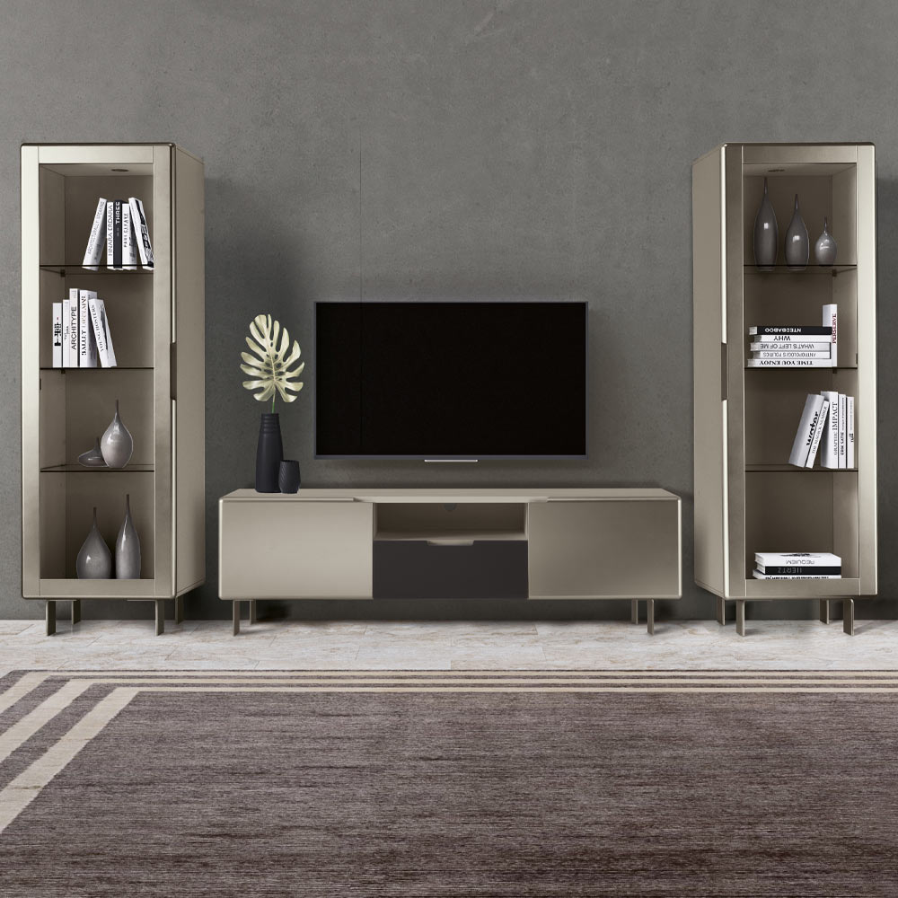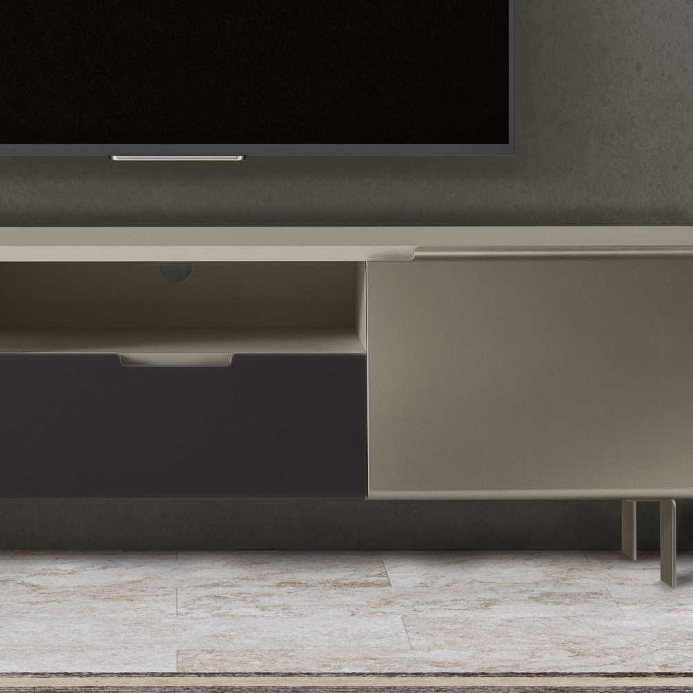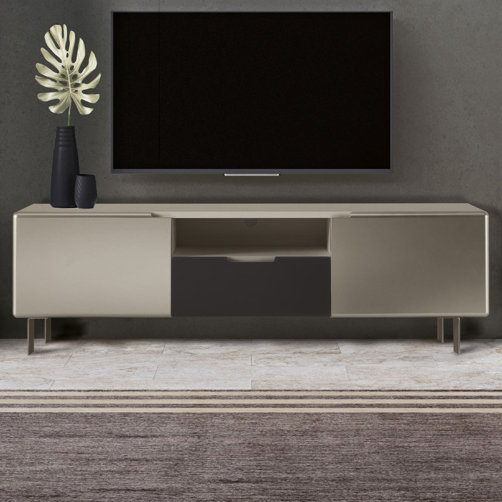 El mueble de TV es un complemento de decoración muy importante en cada hogar y tiene múltiples funciones: desde soportar el televisor hasta tener una función estética y decorativa. Producto moderno y elegante en MDF compuesto por 2 puertas acabado níquel que se abren con bisagras amortiguadas , cuerpoacabado visón y patasde hierrocolor níquel , cajón acabado carbón y un compartimento abierto que garantizan un espacio de almacenamiento extra. Es un complemento de decoración de diseño minimalista que combina una estética elegante con una amplia utilidad y se integra perfectamente en cualquier salón creando una perfecta armonía con los elementos circundantes.