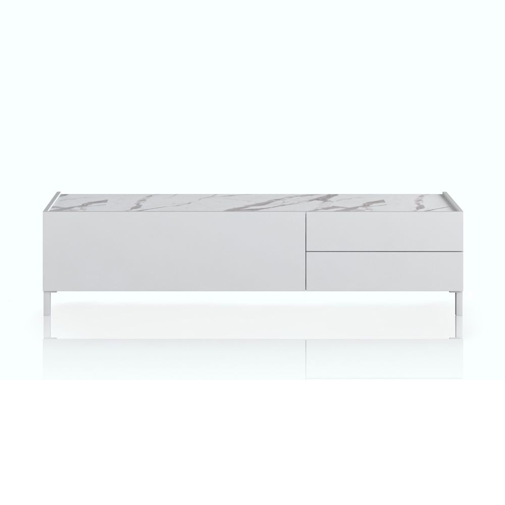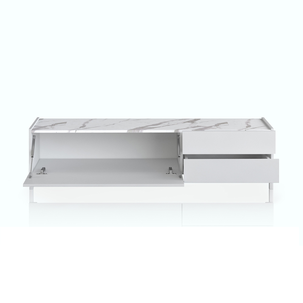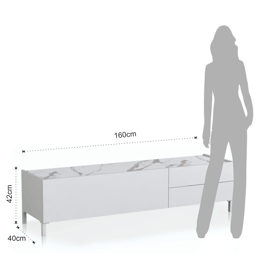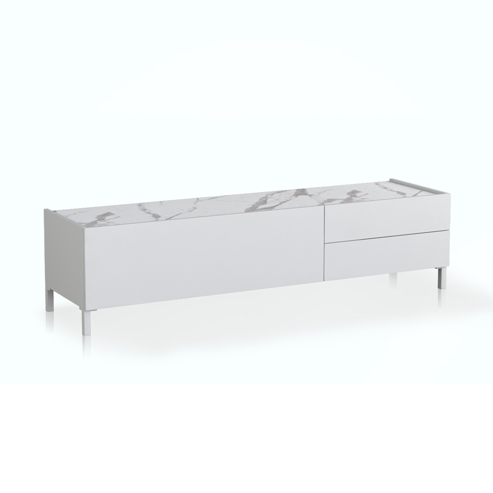 Mueble TV fabricado con paneles de partículas de madera ecológica de 15/16 mm de espesor, lacado blanco brillo , tapa revestida en melamina acabado Mármol Calacatta , con 1 puerta abatible, 2 cajones y pies regulables , integralmente . Gracias a sus acabados, este mueble es perfecto para completar el mobiliario de cualquier salón y salón. Ofrece gran capacidad y espacio para guardar objetos para tenerlos siempre ordenados y al alcance gracias a las puertas y cajones.