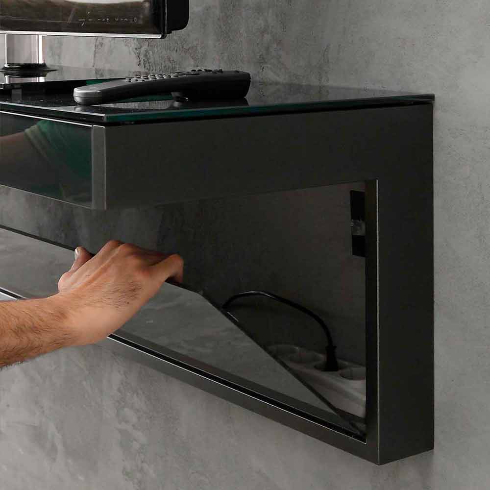 Exclusivo mueble de TV suspendido (montaje en pared) fabricado en Italia con tapa de vidrio negro brillante con orificio para cables, estructura de metal pintado negro mate y panel de plexiglás vertical extraíble. También se completa con un cajón frontal extraíble colocado debajo de la parte superior.