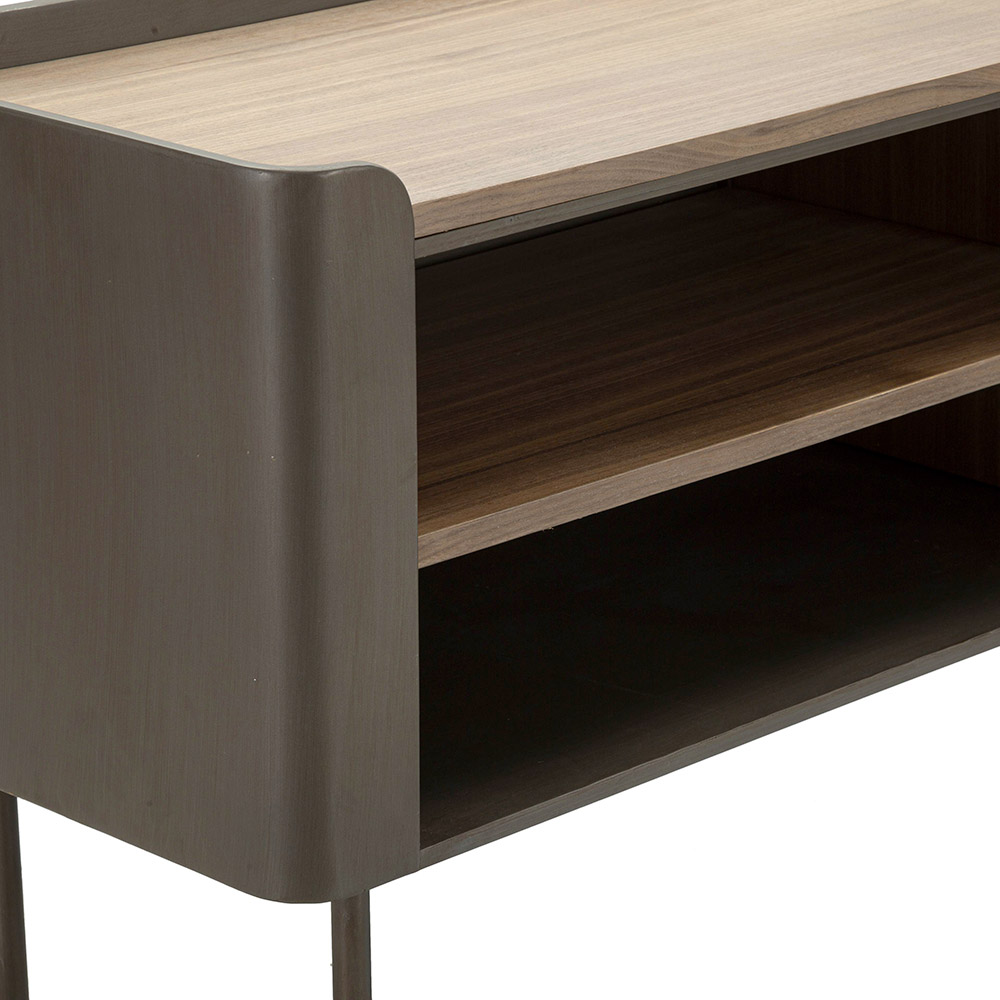 Este mueble para TV de madera y hierro es la quintaesencia de elegancia funcional y diseño refinado. De líneas limpias y estilo minimalista , se integra discretamente en cualquier ambiente, ofreciendo al mismo tiempo una gran superficie y un espacio útil para guardar pequeños objetos gracias a sus cajones prácticos y de fácil manejo. El acabado de madera oscura añade una sensación de calidez y riqueza , mientras que la construcción robusta garantiza durabilidad y estabilidad .