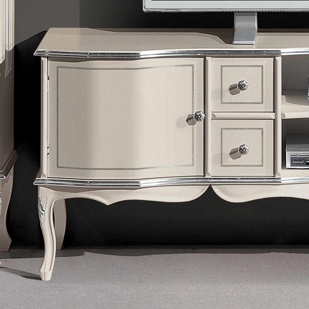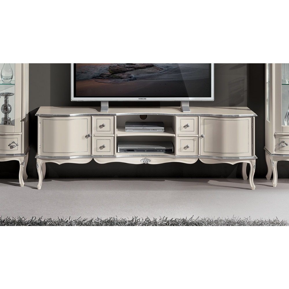 Mueble de TV de salón de estilo clásico con 2 puertas, 4 cajones y 2 compartimentos. El estilo y la artesanía que caracterizan su fabricación se reflejan en este suntuoso mueble, elaborado en fina madera blanca con detalles plateados, un refinado accesorio capaz de realzar el ambiente. Fabricado íntegramente en Italia y elaborado a mano por hábiles maestros artesanos , presenta un acabado con maestría y elegancia. La producción se realiza con materiales de calidad y la elaboración se realiza amano con el máximo cuidado y profesionalidad que distinguen a los productos Made in Italy .
