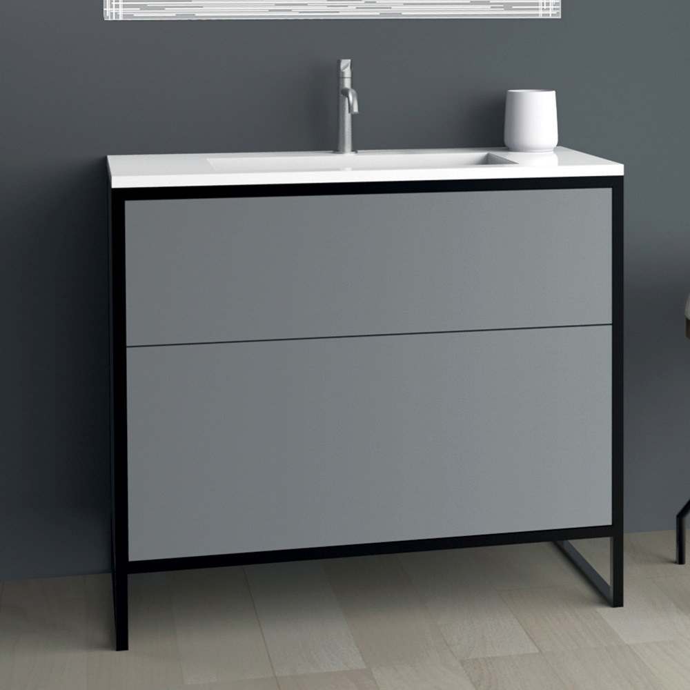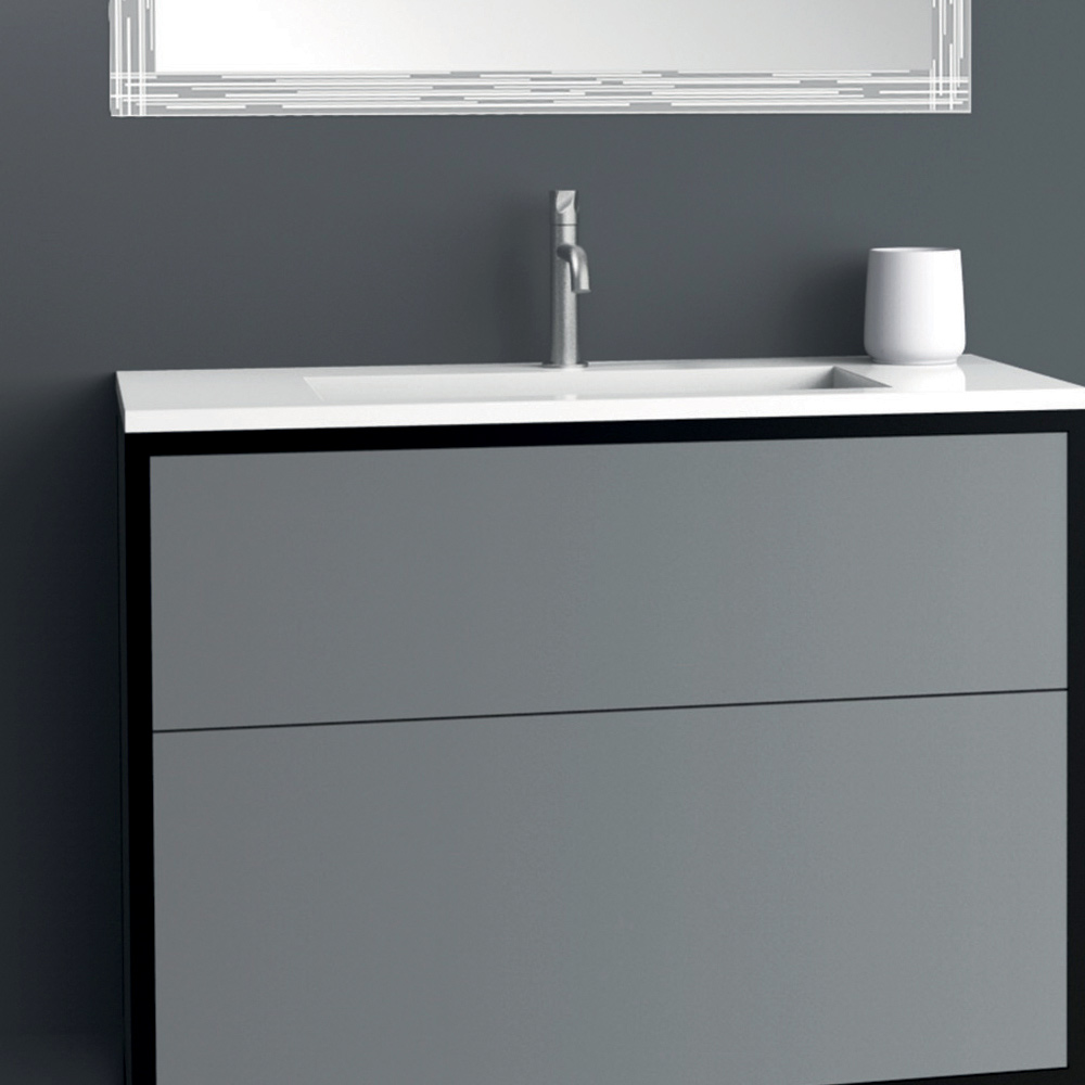 muebles de baño se caracteriza por una estructura realizada con un fino perfil metálico pintado en negro mate, puertas de entrada en madera mdf lacada gris tráfico mate RAL 7042 y encimera integrada en resina de mármol blanco brillo, creando una combinación armoniosa de espacios llenos y vacíos con