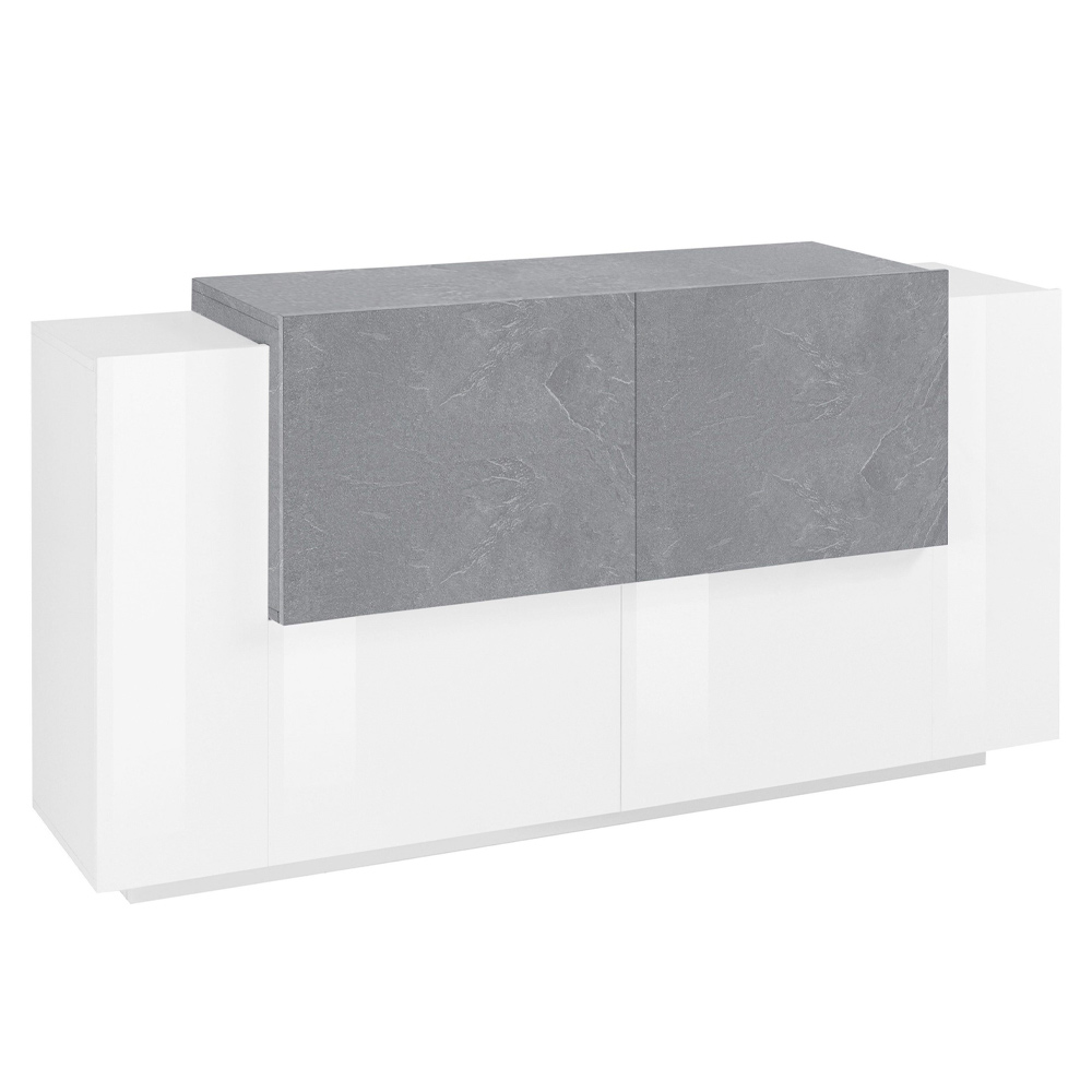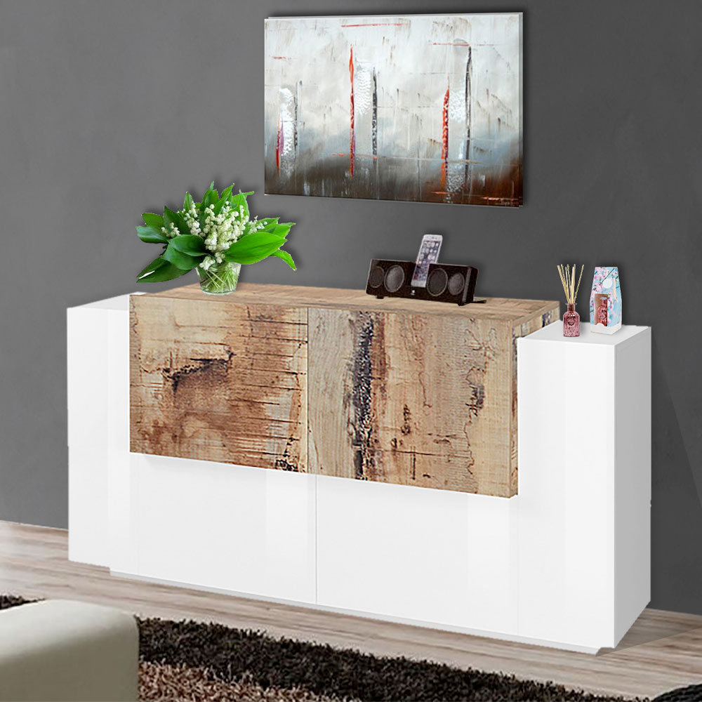 El mueble aparador para el salón consta de 4 puertas en total,2 de madera lacada en blanco brillante y 2 de madera melaminada de arce o pizarra, para crear un contraste llamativo y contemporáneo.