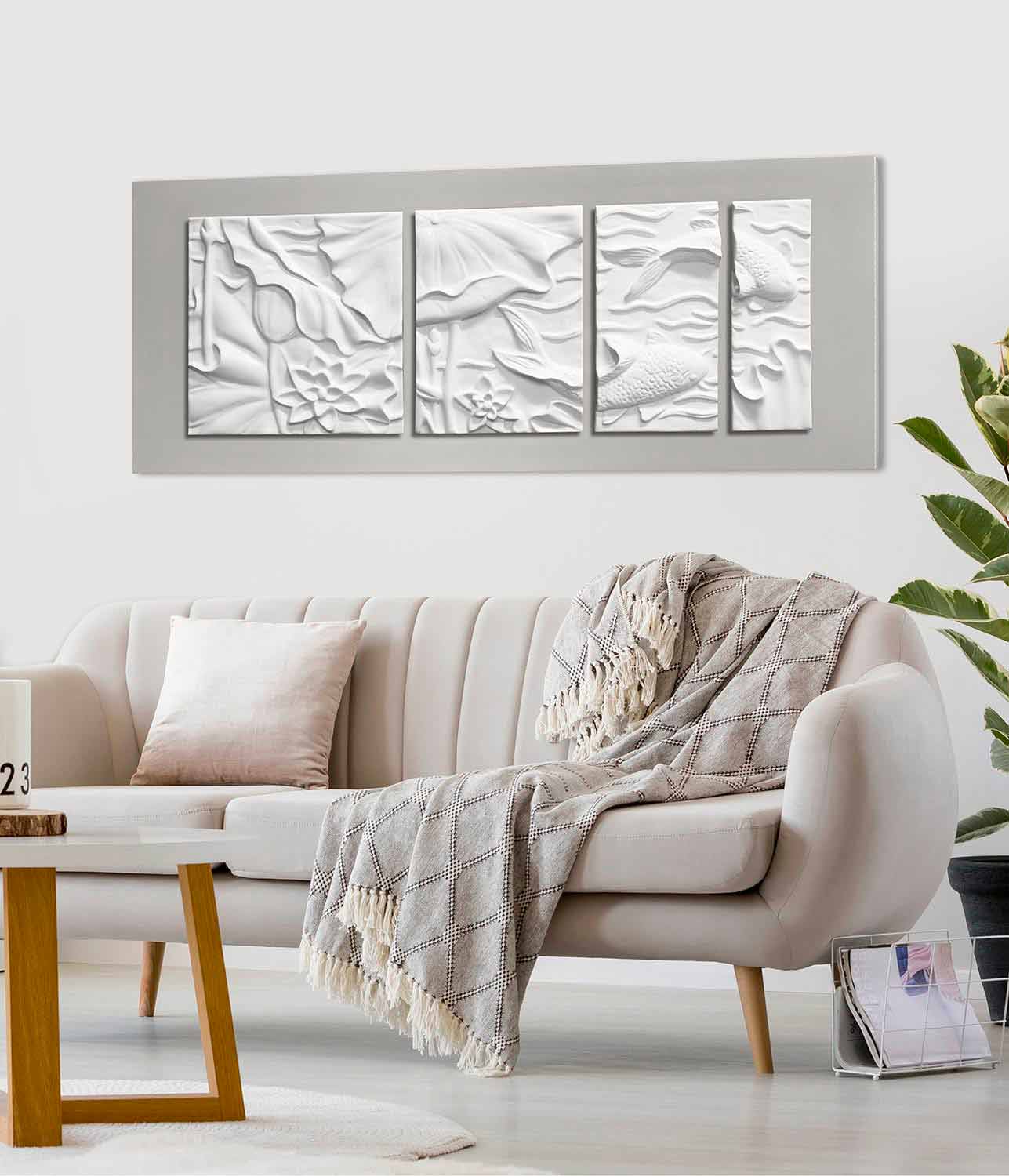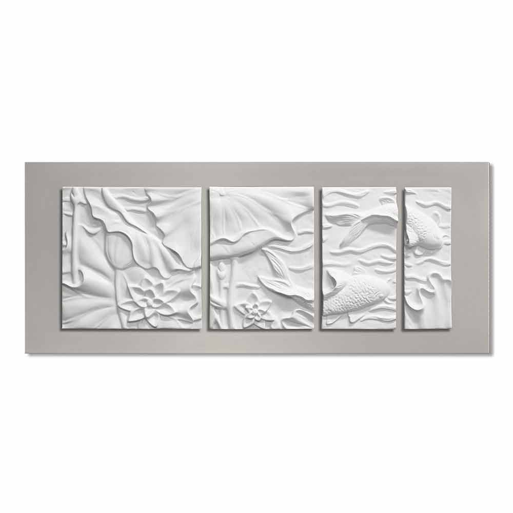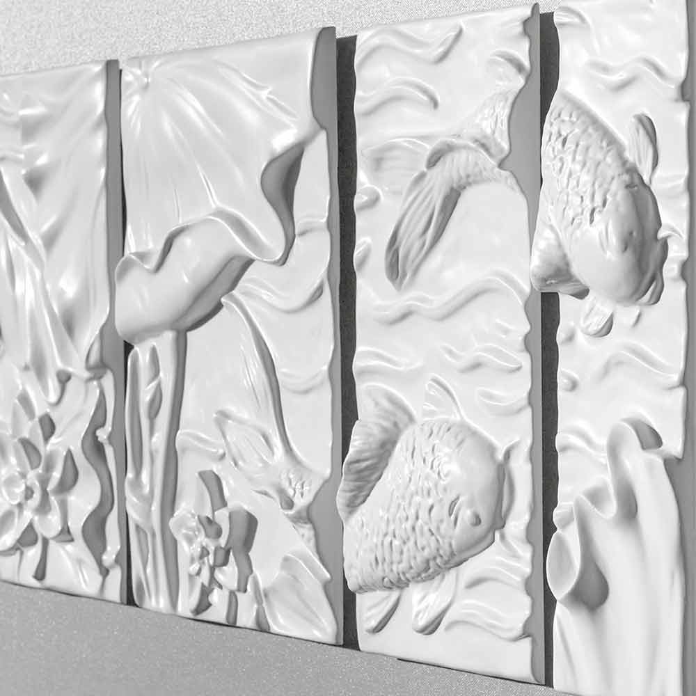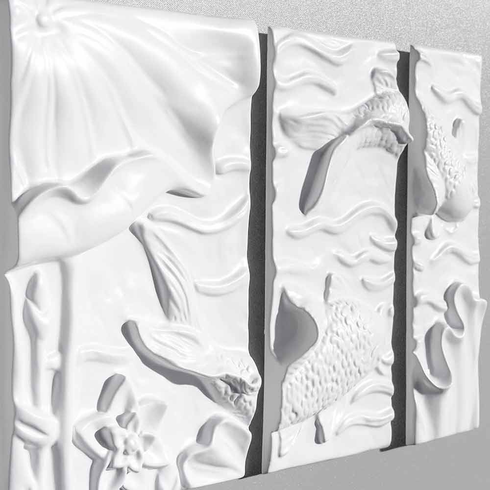 Esta instalación depared de bajorrelieve decorada a mano encerámica compuesta se compone de cuatro elementos con líneas elegantes y formas modernas en blanco marfil que representan la carpa koi japonesa montada sobresaliendo sobre lienzo de seda lacada en gris. El resultado es con un impacto estético minimalista y decorativo, para un estilo único.