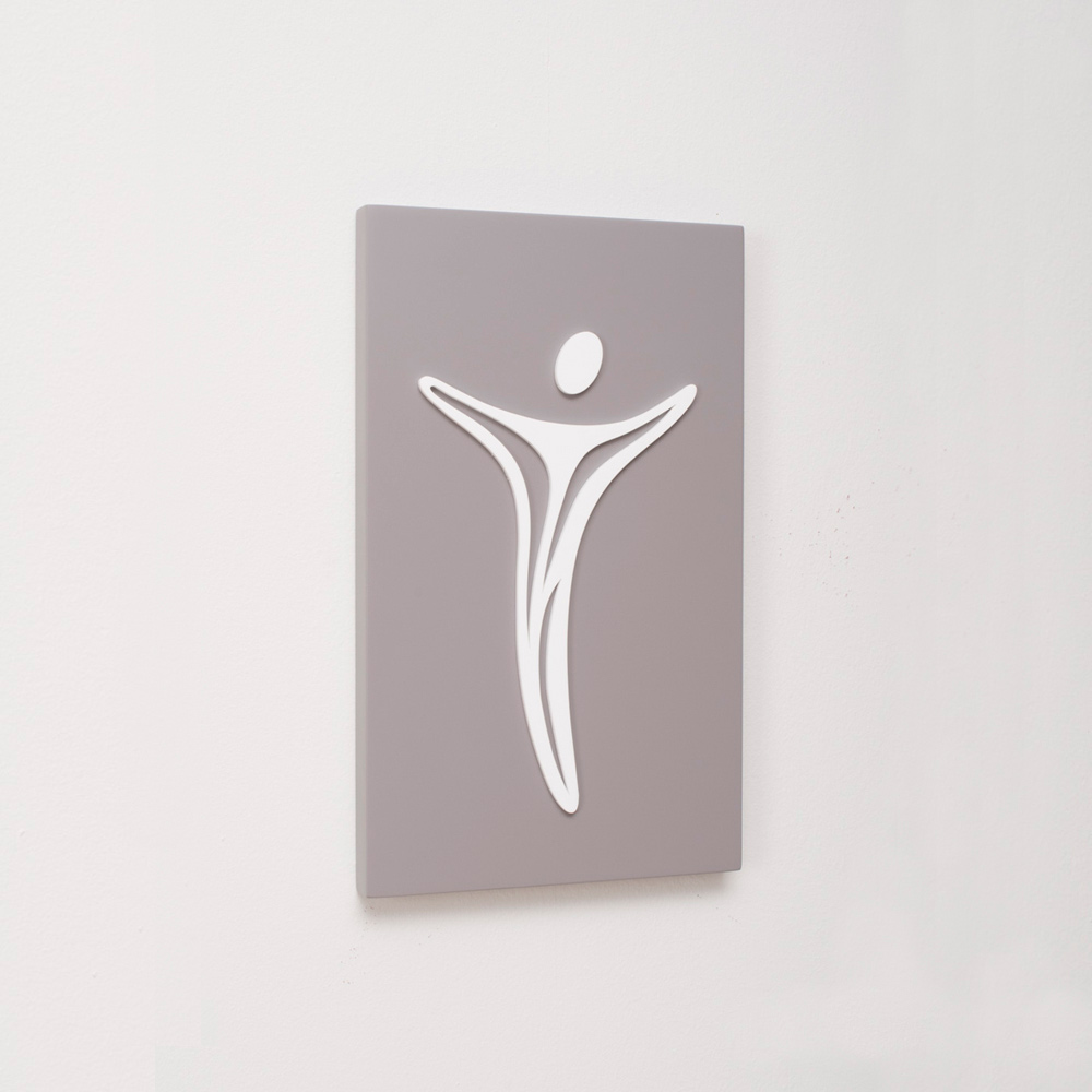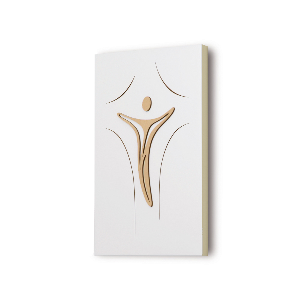 Cuadro/Crucifijo con base de madera lacada y aplicación . "Comas" grabadas con láser . Agujero para colgarlo en la pared.