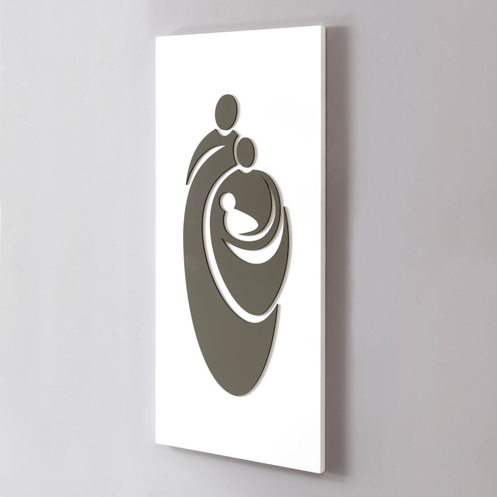 Sagrado marco de madera lacada en blanco con aplicación en madera lacada gris tórtola de la Sagrada Familia estilizada.