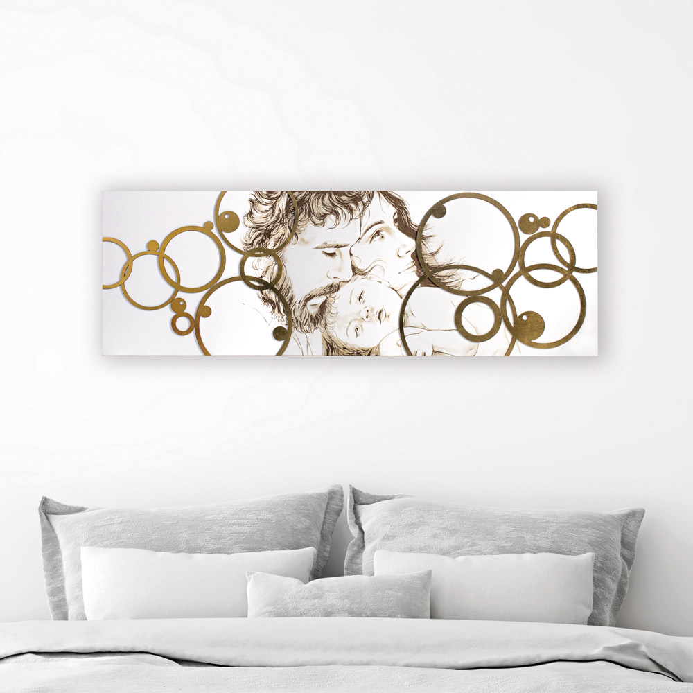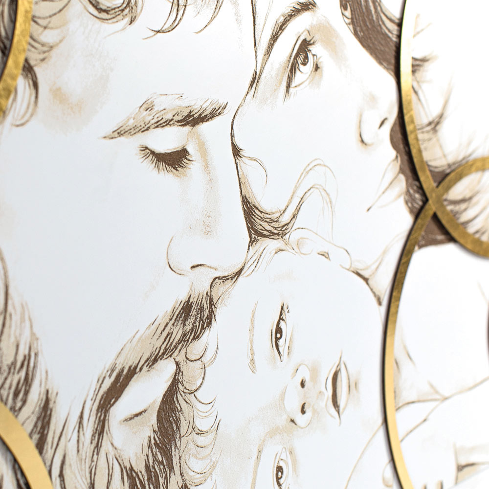 El panel representa a la Sagrada Familia en un estilo moderno . Las decoraciones de pan de oro se aplican al diseño marcado con láser. Panel de madera lacado en blanco mate con marcado láser, una técnica especial que crea un bajorrelieve sobre los materiales. Las aplicaciones están realizadas en pan de oro , una técnica preciosa especial.