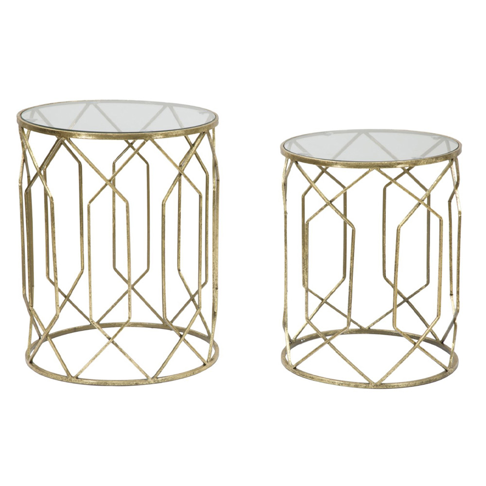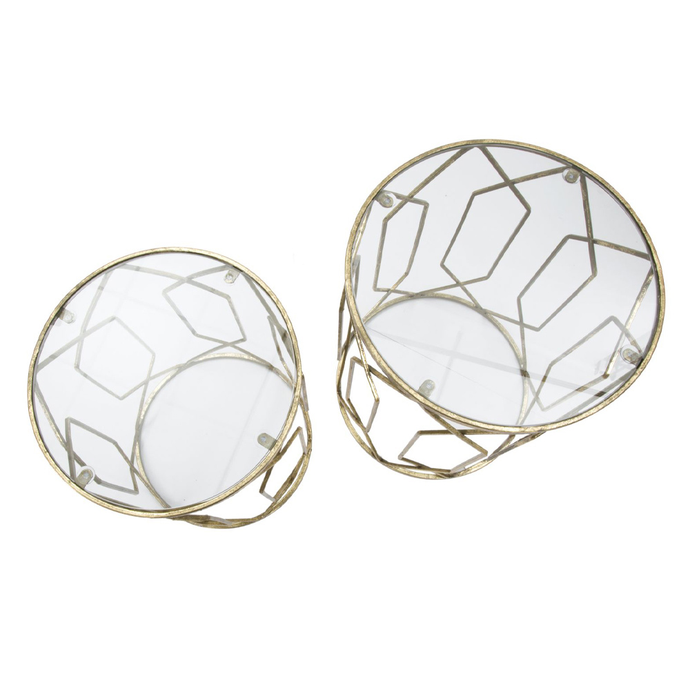 Mesas de centro con estructura de hierro acabado dorado y tapa redonda de cristal transparente . Dos complementos con un diseño simple y versátil pensados para completar salones de estilo elegante con carácter y personalidad para un resultado exclusivo y refinado . Su peculiaridad es la maravillosa textura geométrica que caracteriza a toda la estructura, aumentando su valor y singularidad junto con la refinada tapa de vidrio que enfatiza su sofisticada estética .