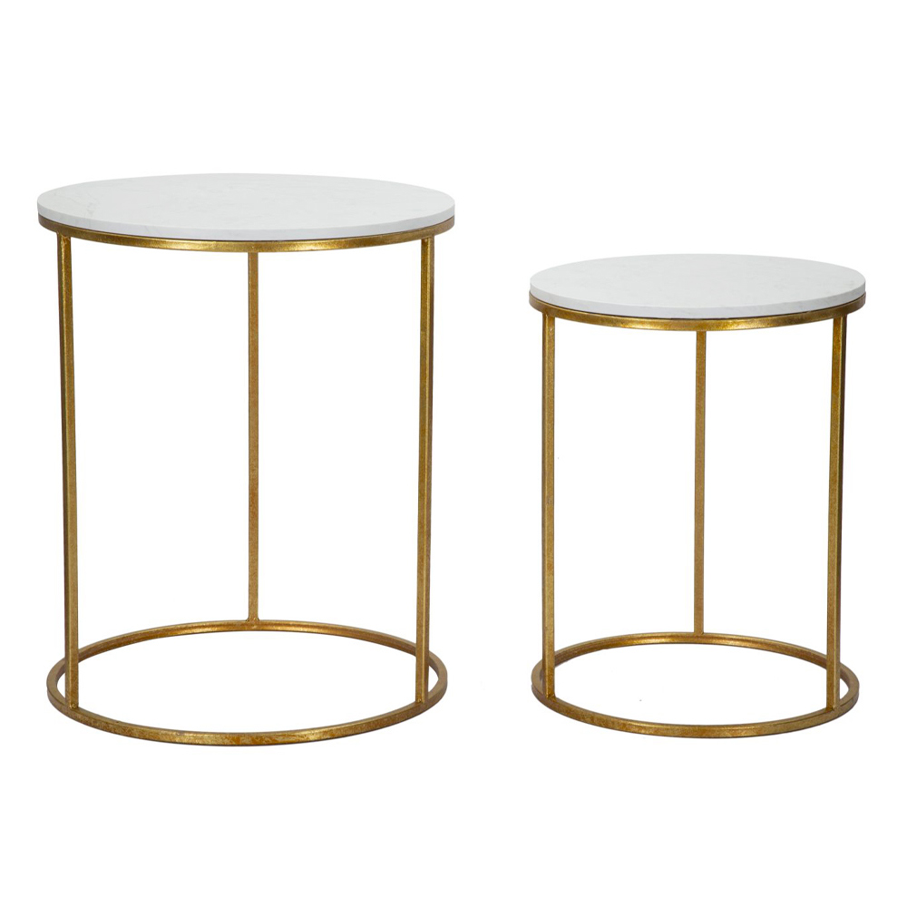 Mesas de centro con estructura de hierro acabado dorado y tapa redonda en resina efecto mármol blanco . Dos complementos con un diseño simple y versátilpensados para completar salones de estilo elegante con carácter y personalidad para un resultado exclusivo y refinado . La esencialidad de las formas representa su fuerza real, caracterizando toda la estética y aumentando su valor junto con la tapa de vidrio refinado que subraya su aspecto sofisticado .