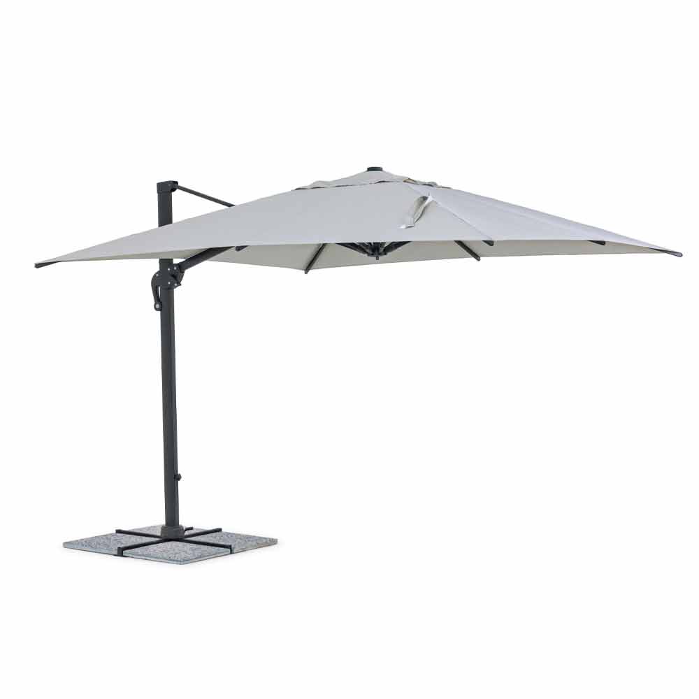 Estructura de aluminio pintado en polvo (poliéster). Poste de 93x57mm. 8 varillas 28x18mm. Tejido de poliéster gris claro 250gr / m2 con revestimiento de pa (poliamida). Base cruzada en acero . Poste giratorio de 360 ° con pedal. Inclinación vertical con asa de 5 posiciones. Incluye funda de paraguas.