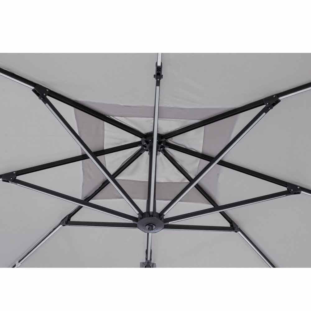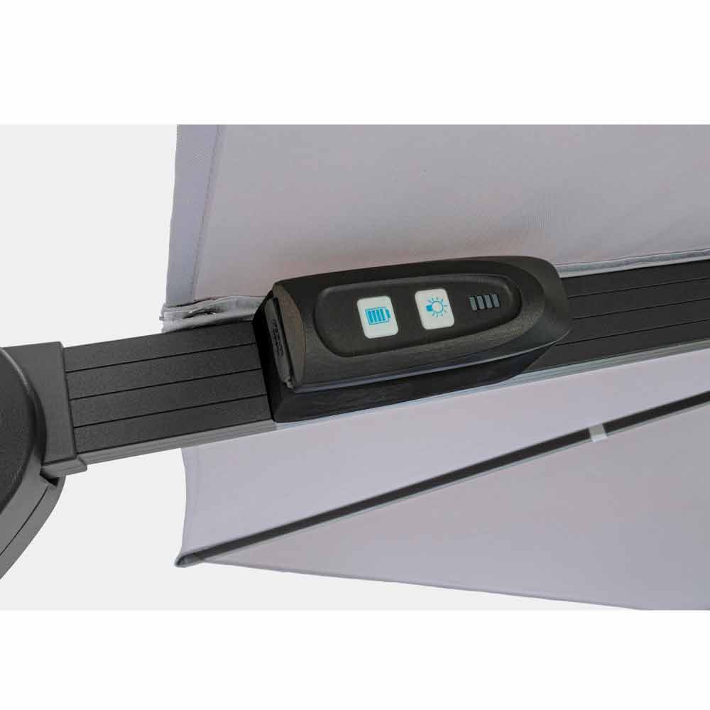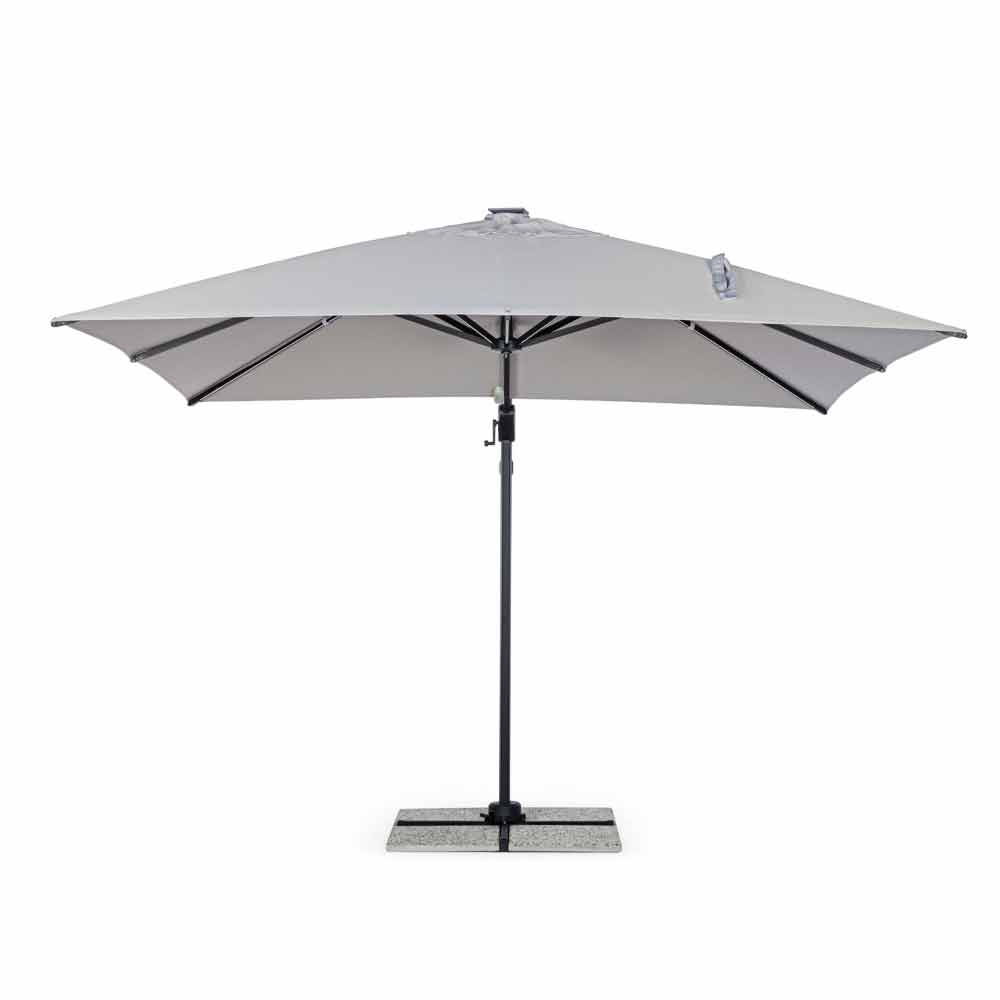 Estructura de aluminio pintado en polvo (poliéster). Poste 77x53mm, 8 varillas 24x14mm con luces led blancas recargables con panel solar incluido. Tejido de poliéster gris claro 250gr / m2 con revestimiento de pa (poliamida). Base cruzada en acero . Poste giratorio de 360 ° con pedal. Inclinación vertical con asa de 4 posiciones. Incluye funda de paraguas.