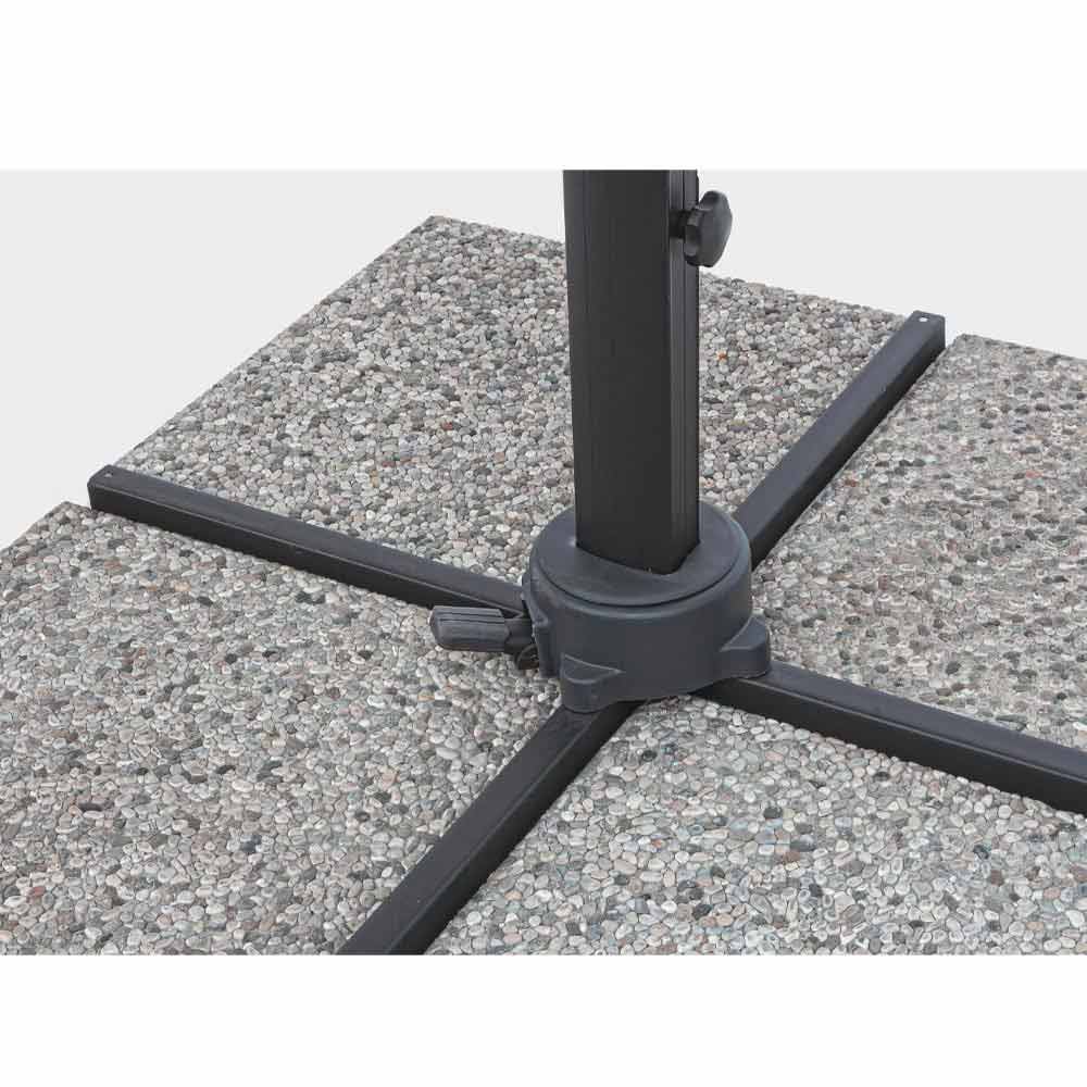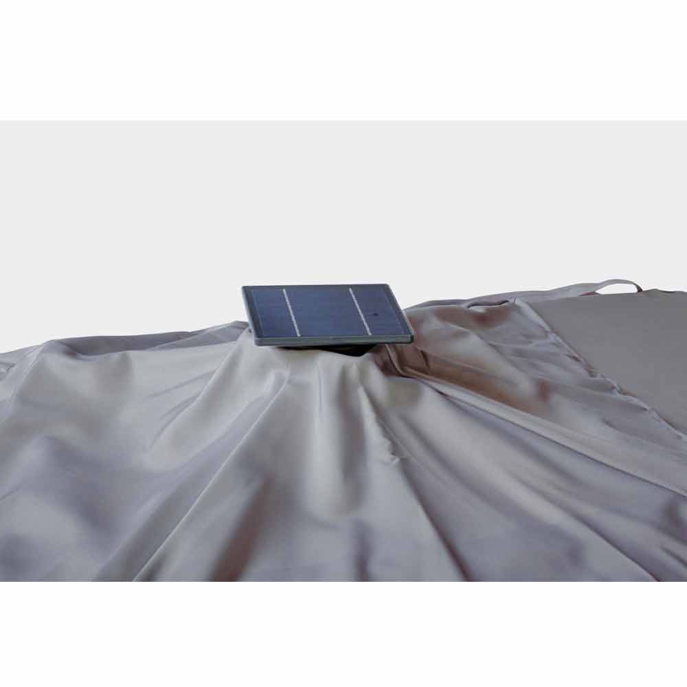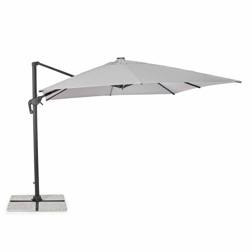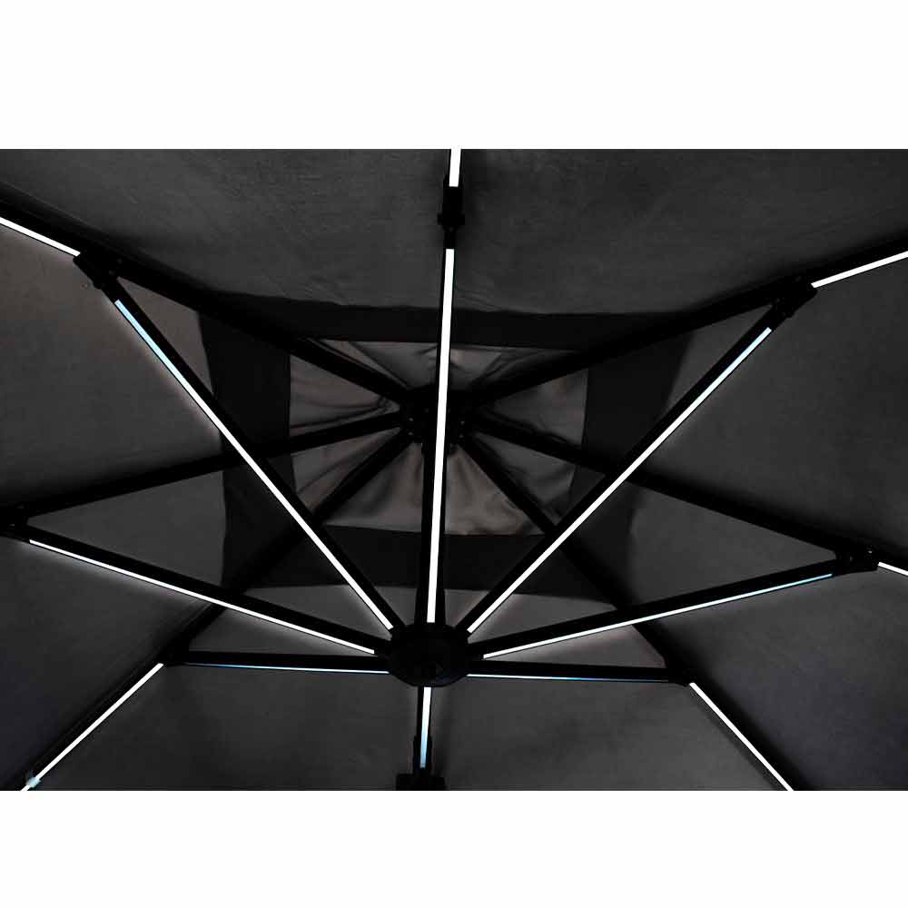Estructura de aluminio pintado en polvo (poliéster). Poste 77x53mm, 8 varillas 24x14mm con luces led blancas recargables con panel solar incluido. Tejido de poliéster gris claro 250gr / m2 con revestimiento de pa (poliamida). Base cruzada en acero . Poste giratorio de 360 ° con pedal. Inclinación vertical con asa de 4 posiciones. Incluye funda de paraguas.