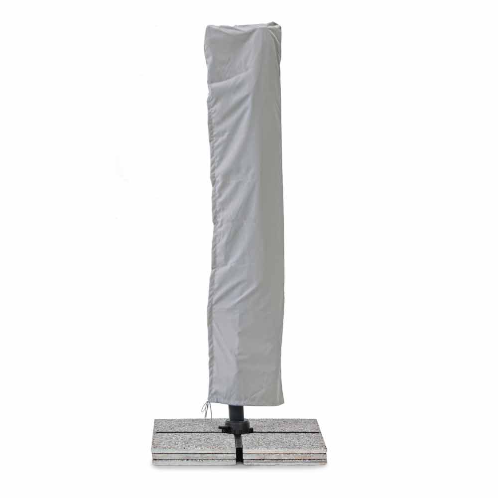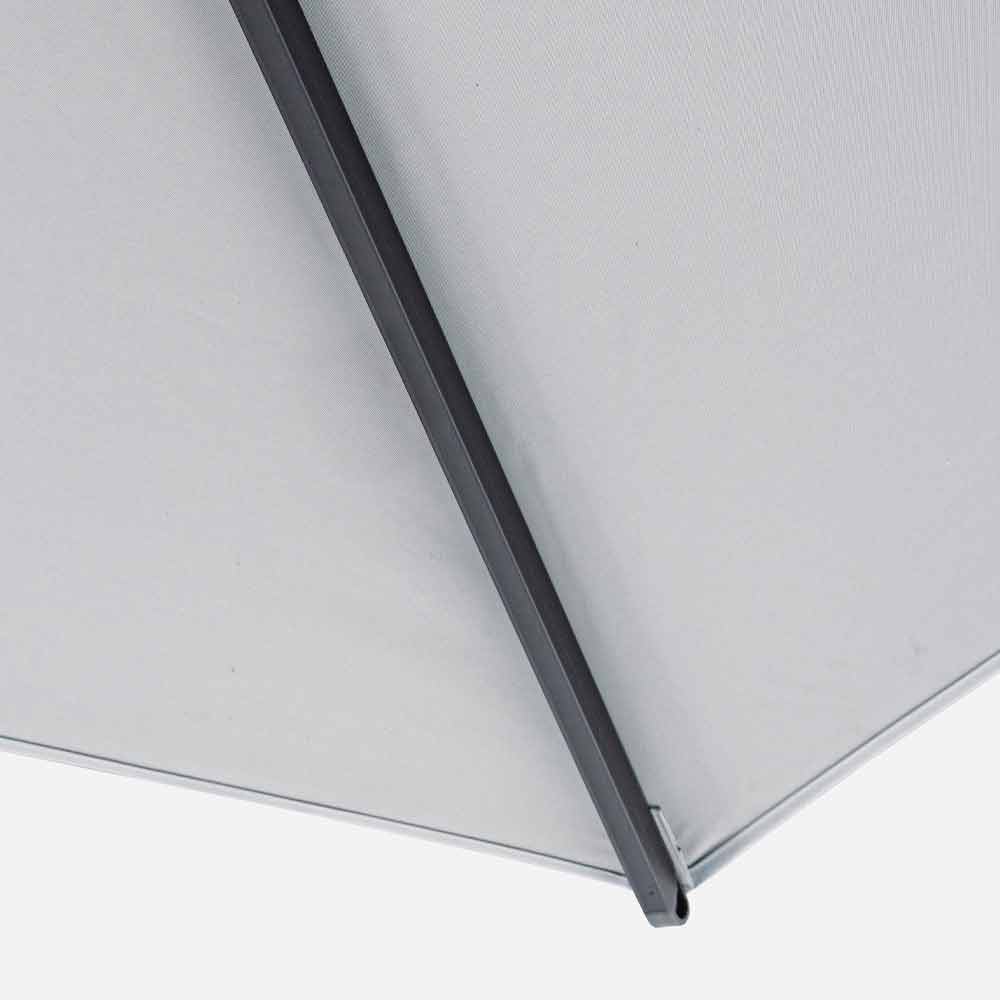 Estructura de aluminio pintado en polvo (poliéster). Poste de 93x57mm. 8 varillas 28x18mm. Tejido de poliéster gris claro 250gr / m2 con revestimiento de pa (poliamida). Base cruzada en acero . Poste giratorio de 360 ° con pedal. Inclinación vertical con asa de 5 posiciones. Incluye funda de paraguas.