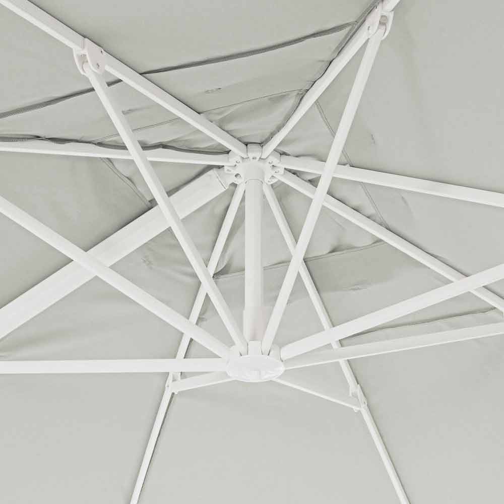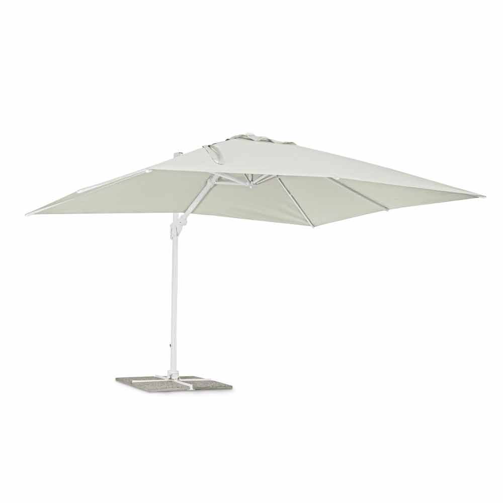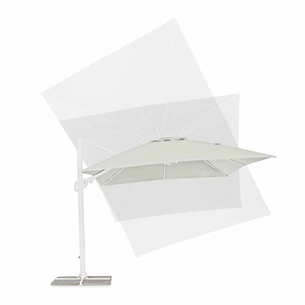 Estructura de aluminio pintado en polvo (poliéster). Mástil de 90x60mm, 8 varillas de 25x17mm, tejido poliéster natural 250gr / m2 con revestimiento de pa (poliamida), base en cruz de acero, mástil giratorio 360 ° con pedal. Inclinación vertical con asa de 5 posiciones, equipada con un sistema de inclinación de paraguas de derecha a izquierda. Incluye funda de paraguas. Azulejos no incluidos .