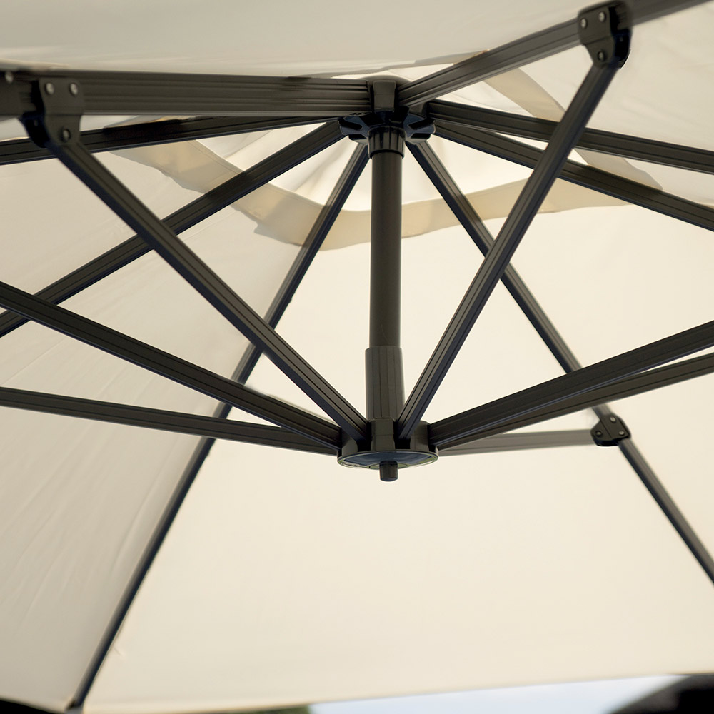 Esta sombrilla lateral combina diseño moderno, practicidad y durabilidad , ofreciendo una elegante protección para cualquier espacio exterior. Su estructura de aluminio , con un mástil de 77 x 53 mm y ocho varillas de 14 x 24 mm , garantiza estabilidad y robustez, manteniendo una estética limpia y contemporánea.