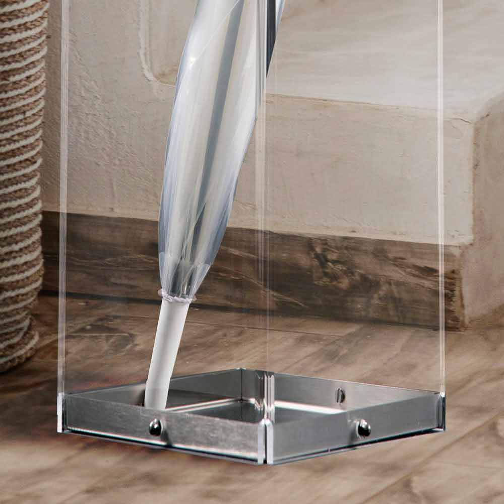 El paragüero en plexiglás transparente se caracteriza por su diseño minimalista y completamente liso, sin adornos ni adornos, para resaltar las líneas puras y simples con una base de acero inoxidable.