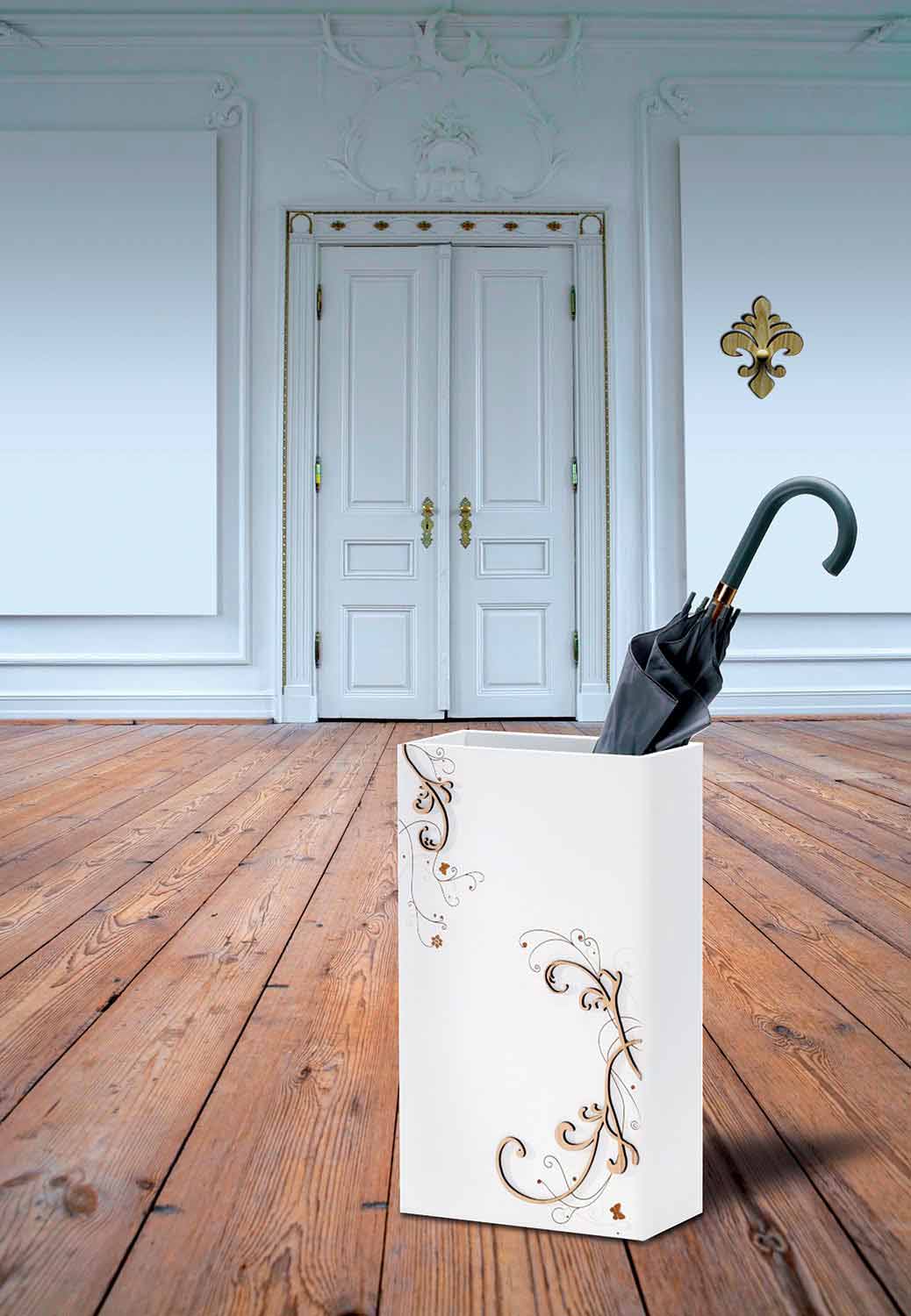Dale un toque de extrema elegancia y refinamiento a tu espacio de vida o entrada con la reinterpretación más clásica del paragüero de madera lacada con aplicaciones de decoración con clase. En su interior contiene una práctica bandeja para recoger agua.