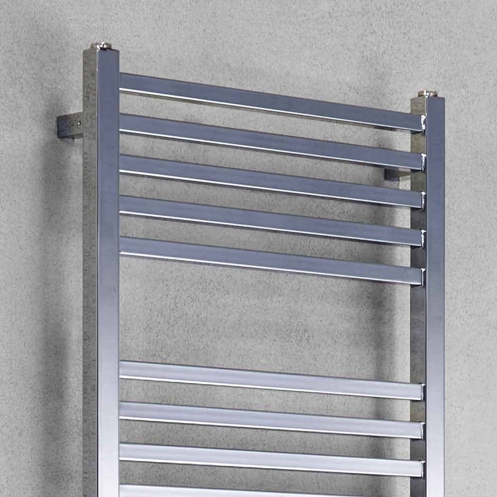 Radiador toallero hidráulico de diseño cuadrado cromado en acero, fabricado en Italia.