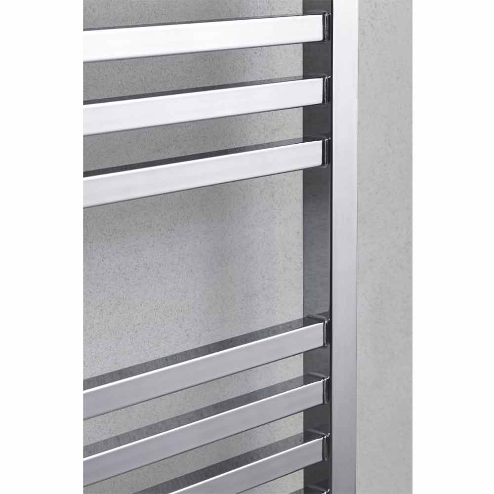 radiador hidráulico presenta un diseño cromado con tubos cuadrados verticales de 30x30 mm y tubos cuadrados horizontales de 20x20 mm.