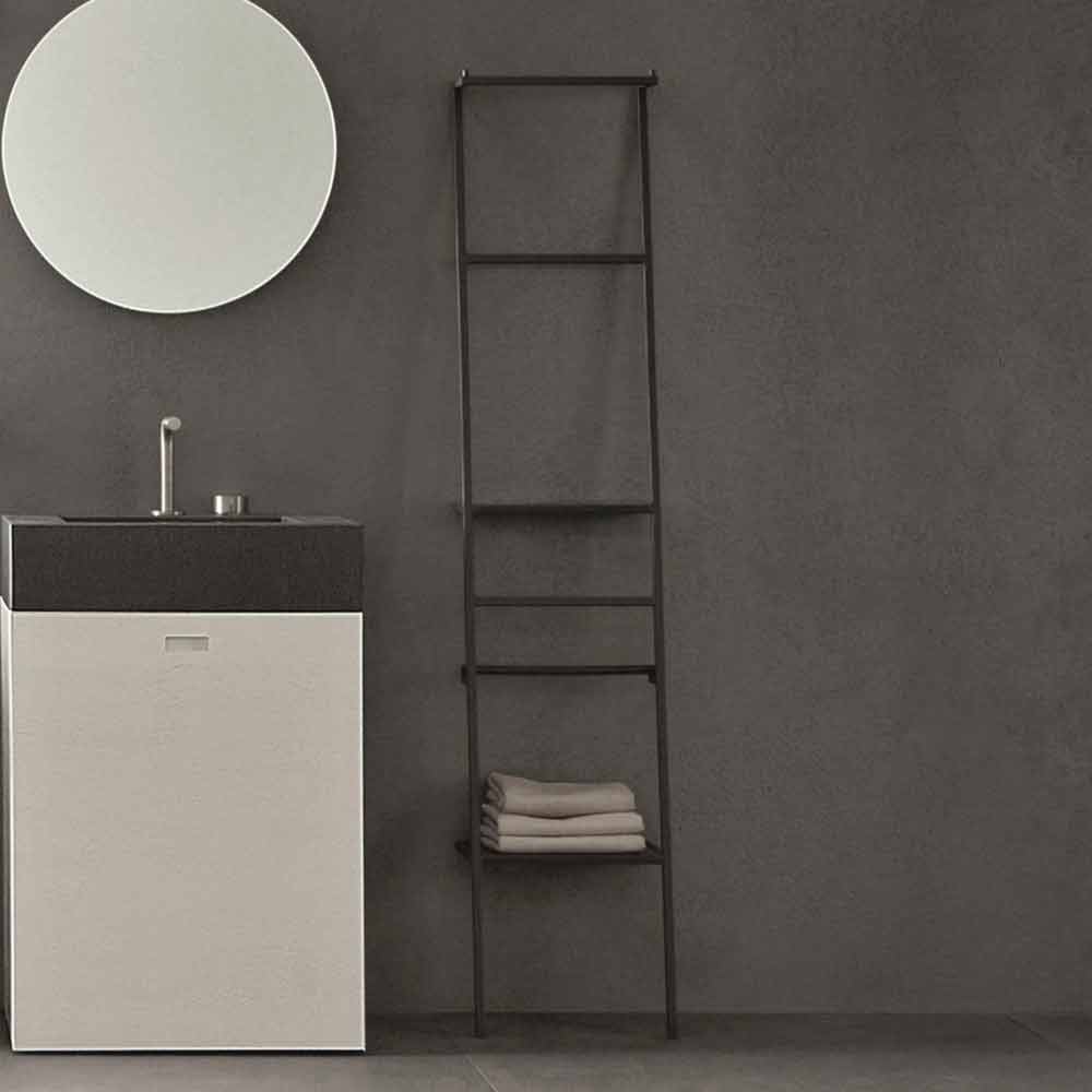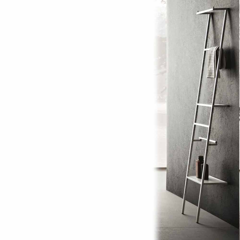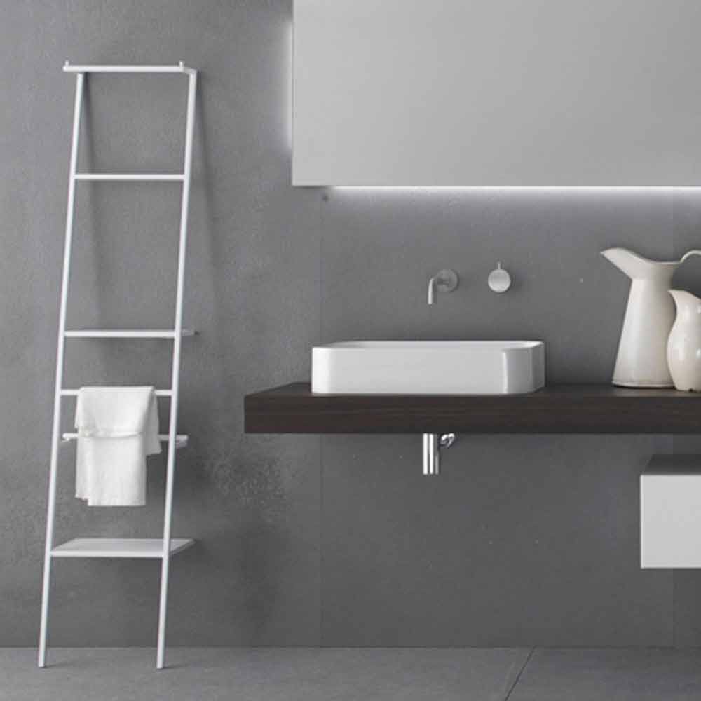 Escalera colgante en metal pintado mate con un diseño minimalista y extremadamente funcional. Está equipado con estantes, ganchos para albornoces, barras antivuelco y toalleros. Disponible en blanco mate u otros colores mate.