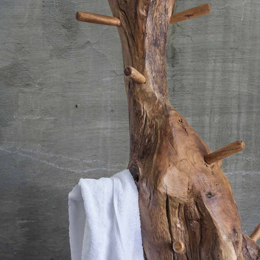 Perchero, gancho para batas y toallero en teca de Birmania maciza fabricada con troncos de árboles. Base y clavijas en Teca.